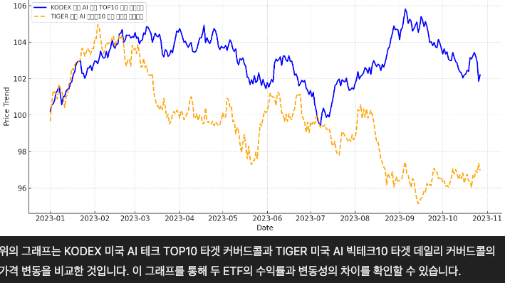 위의 그래프는 KODEX 미국 AI 테크 TOP10 타겟 커버드콜과 TIGER 미국 AI 빅테크 10 타깃 데일리 커버드콜의 가격 변동을 비교한 것입니다. 이 그래프를 통해 두 ETF의 수익률과 변동성의 차이를 확인할 수 있습니다.