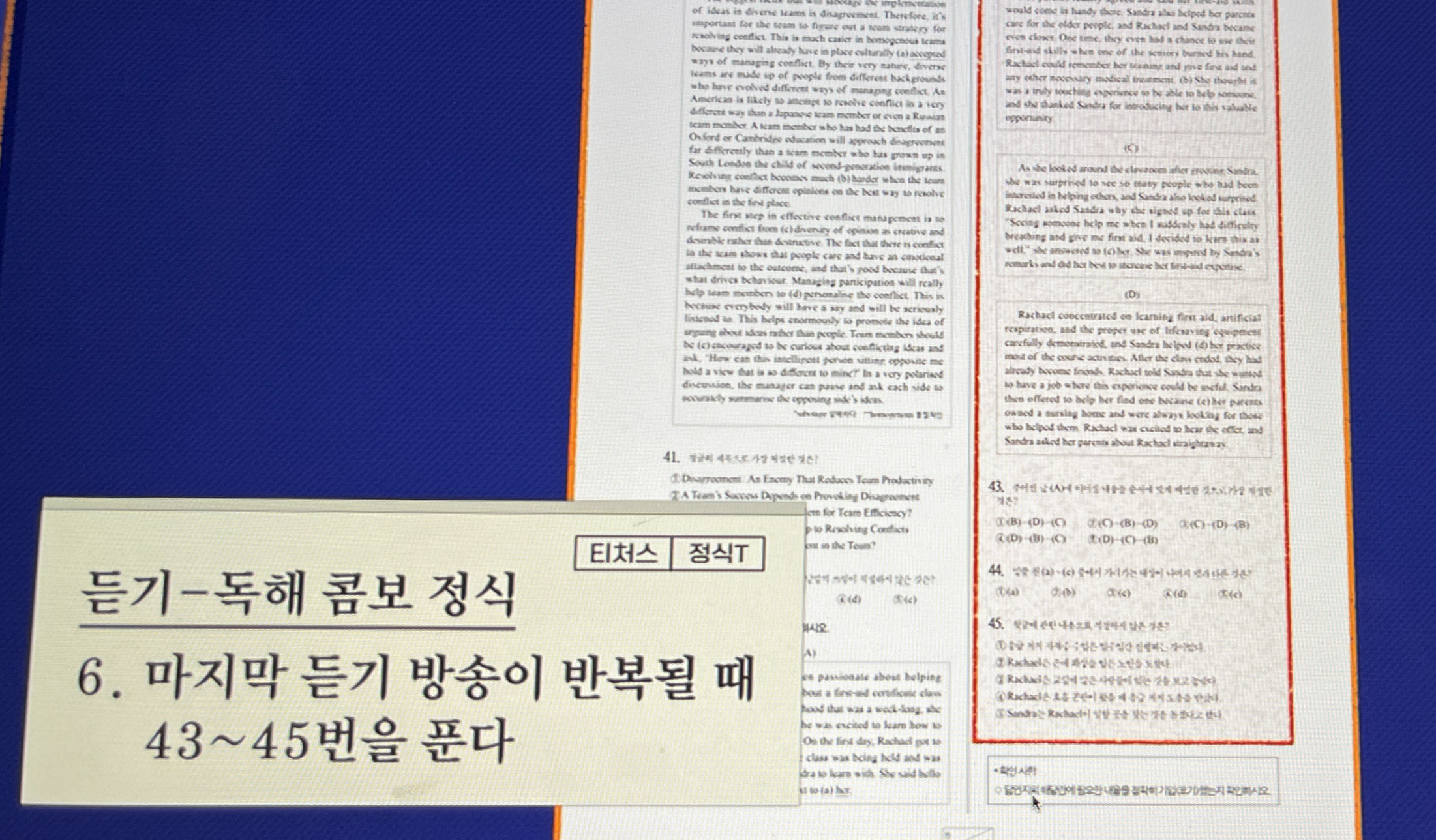 6. 1-17문제가 듣기문제예요. 그중에 16,17번 문제는 두 번 들려줍니다. 대부분 두 번째 들려주는 영어 듣기는 의미가 없다고 하는군요. 의미 없는 시간을 흘려보내지 말고 43-45번 문제를 풉니다.