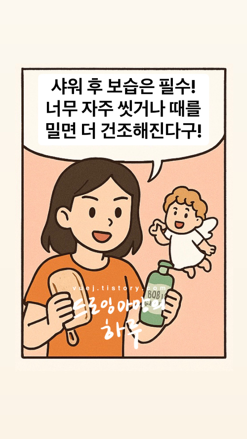 샤워를 자주 하거나 너무 뜨거운 물로 씻으면 피부의 천연 보호막인 **피지막(유분)**이 사라지면서 수분이 쉽게 증발하게 돼요.