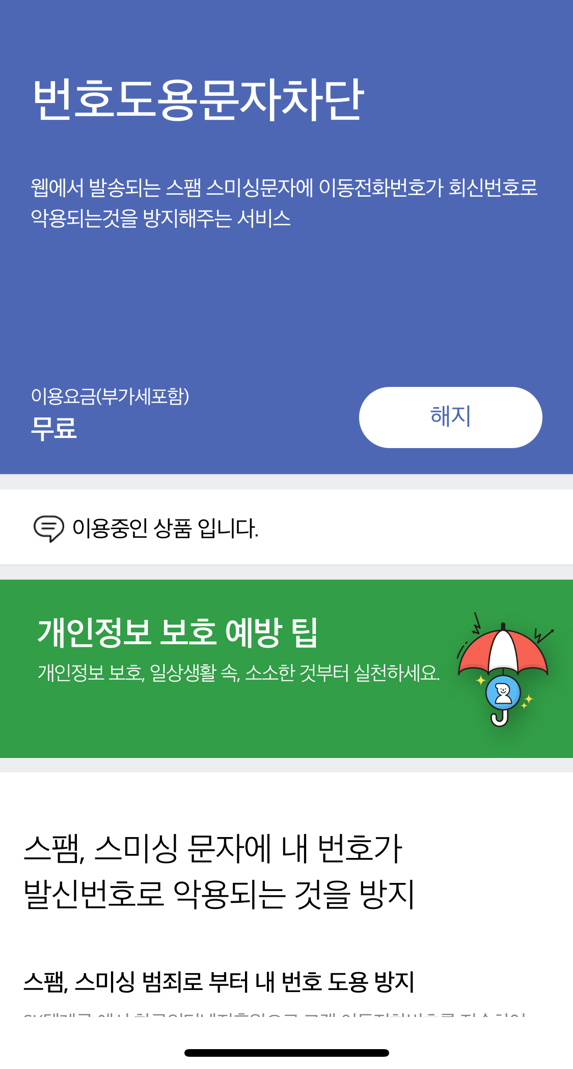 - 내 번호를 악용해 스팸문자 발송하는 걸 차단