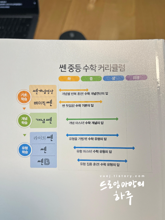 아이가 학원에서 문제유형을 다양하게 풀 때 활용하기도 하더군요. 기초부터 심화까지 다양한 구성이 체계적이어서 아이 중학교 수학 공부를 쎈으로 잡고 있어요. 내신과 수능 대비를 목표로 하며, 다양한 유형의 문제를 통해 문제 해결 능력을 키우는 데 초점을 맞춘 문제집입니다.