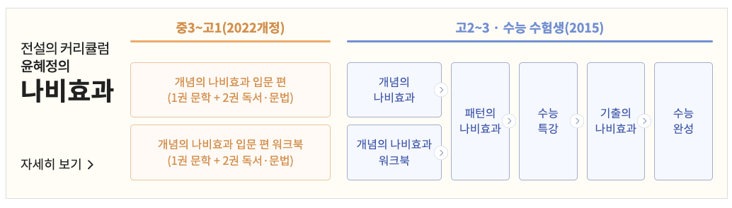 고등학교 내신과 수능 국어는 서로 다른 접근이 필요하지만, '나비효과'는 두 가지를 모두 아우르는 교재입니다. 워크북에 포함된 기출문제는 내신과 수능 문제를 연계해 학습 효과를 극대화해요. - 입문편의 강점: 쉬운 시작