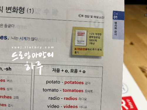 아래 사진처럼 <중학영문법 3800제 스타터> 개념 설명 옆에 <중학영문법 3800제 1학년>에서 추가 문제를 풀 수 있도록 연계되어 있어서 습득하는데 도움이 되요
