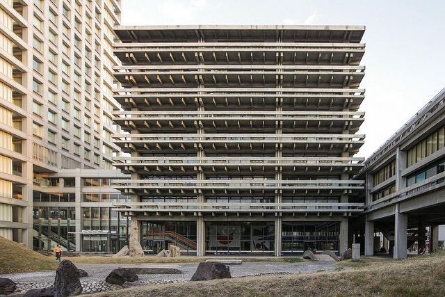 1958년 완공된 가가와현청 동관(Kagawa Prefectural Government Office East Building)은 가가와현 다카마쓰시에 위치한 탄게의 대표작입니다. 이 건물은 일본 전후 현대 건축의 상징으로, 2022년 일본의 중요문화재로 지정되었어요. 탄게는 이 프로젝트에서 르 코르뷔지에의 모듈러 시스템을 도입해 1.8m x 1.8m 모듈을 기반으로 기둥, 문, 창문, 바닥 타일을 설계했습니다. 이로 인해 건물은 깔끔하고 조화로운 인상을 주죠.