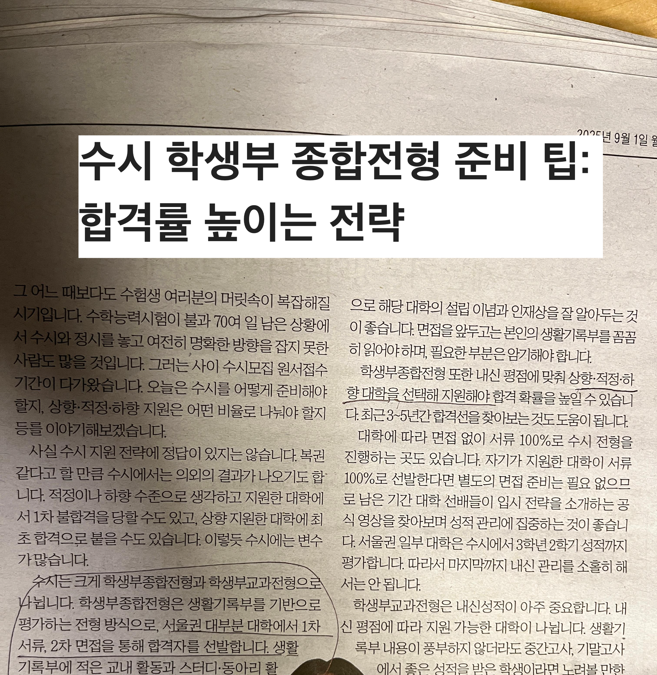 | 대학입시]세특에서 진로적성보다 학업역량을 중요하게 생각해야 하는 이유 (0) | 2025.09.09 |