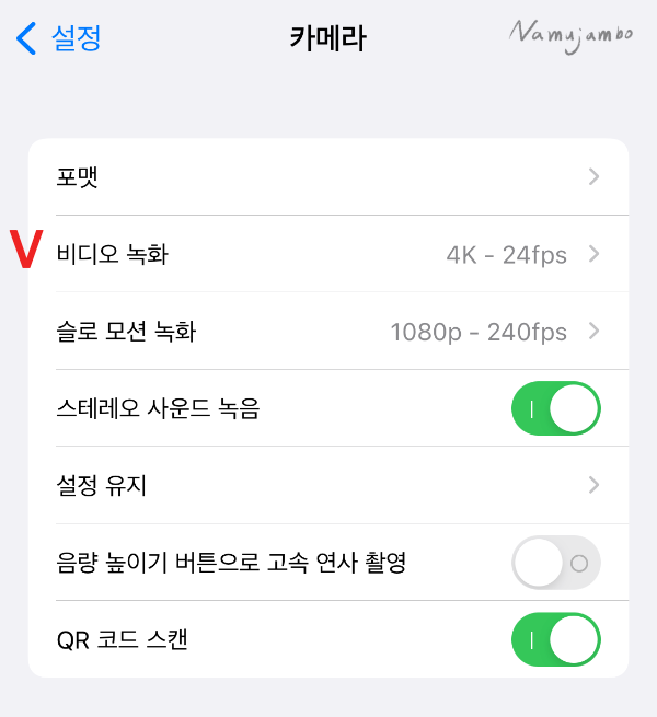1. 핸드폰에서 설정 - 카메라 - 비디오 녹화에서 아래쪽 HDR비디오(고효율성)을 비활성화시켜주세요