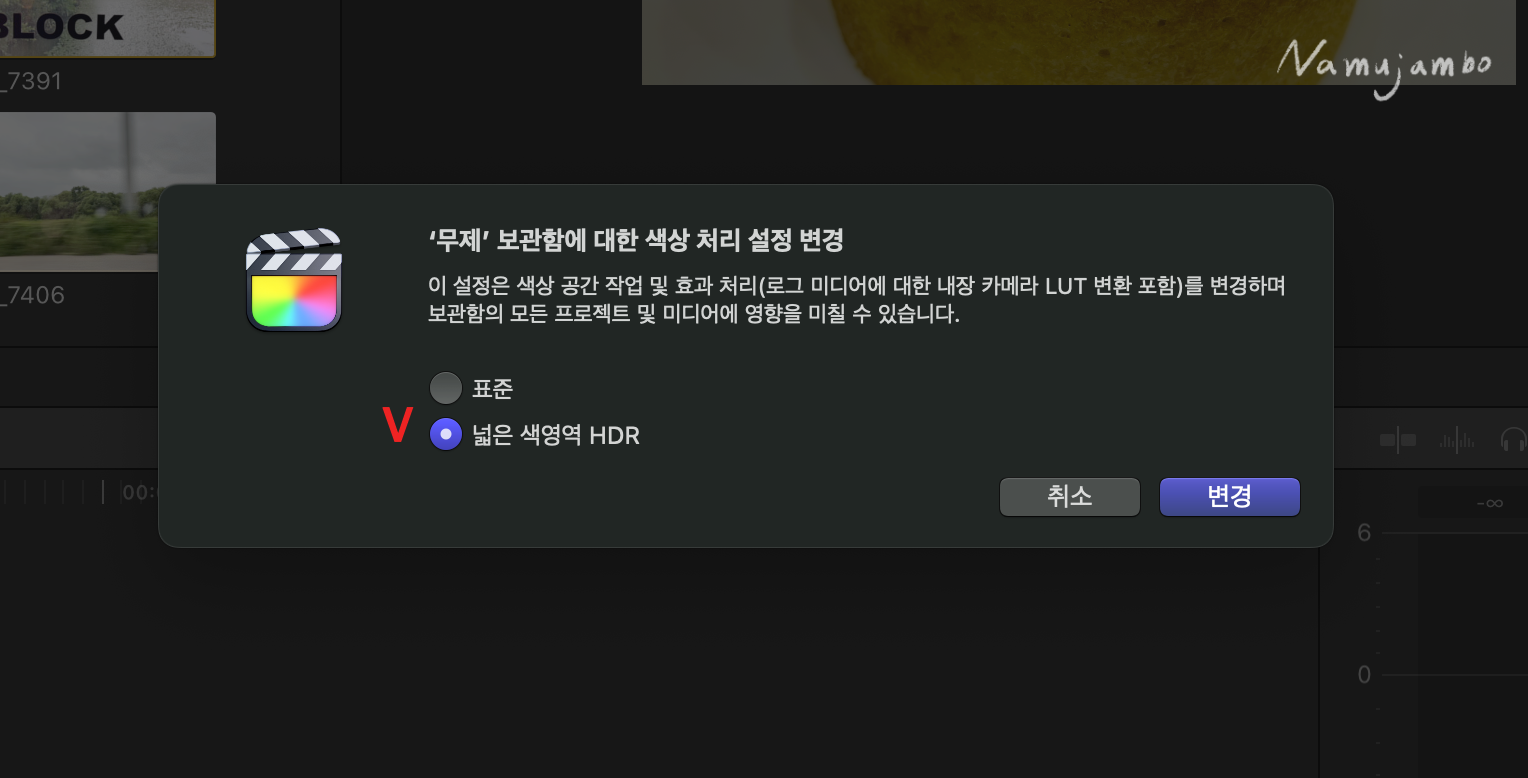 2. 파이널 컷 프로에서 동영상 불러오기 - 왼쪽 상단 폴더 묶음 선택 - 오른쪽 상단 '수정' 선택 - 색상 처리 창애서 '넓은 색 영역 HDR' 선택