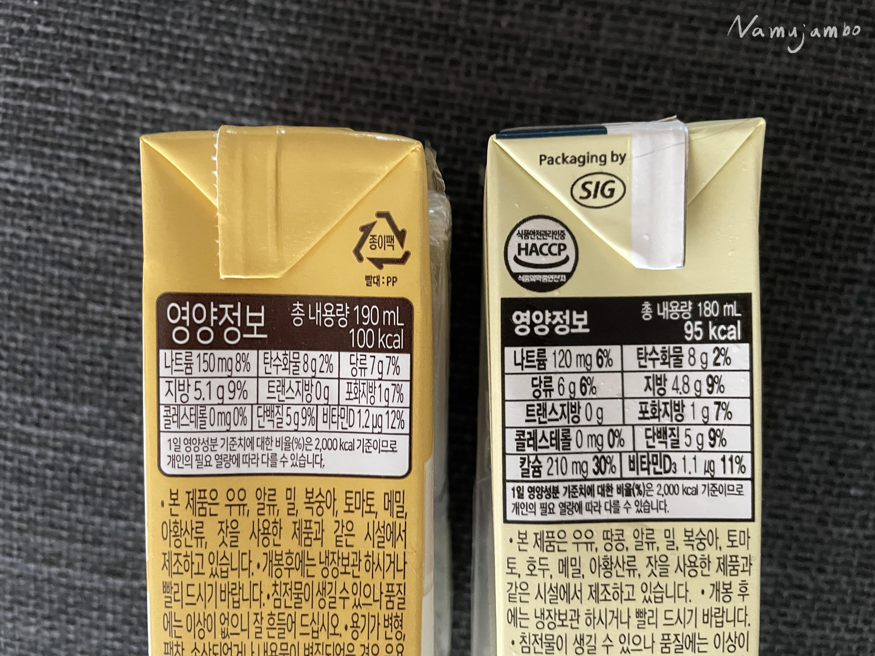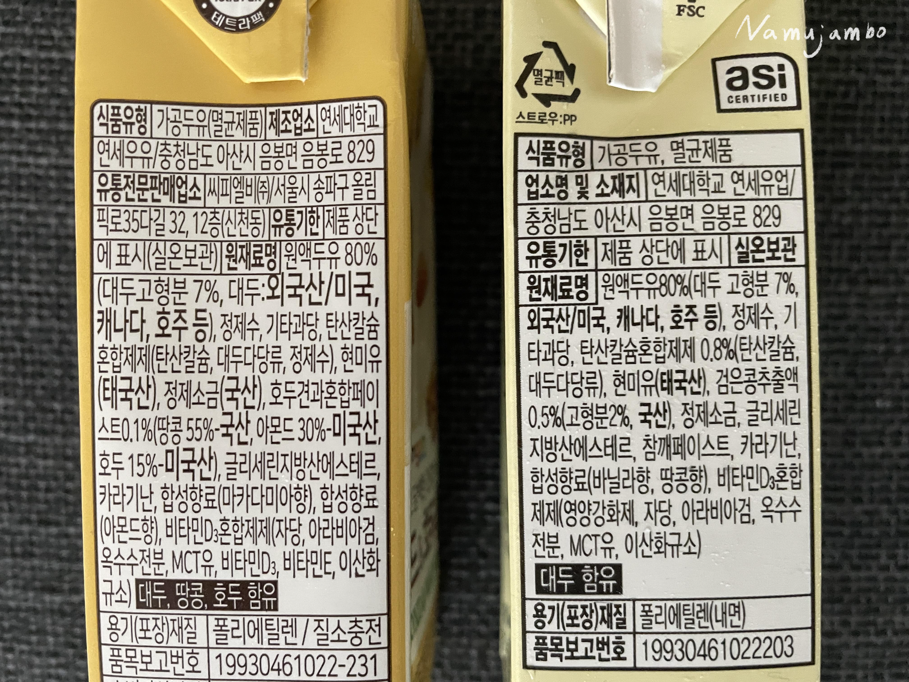 뼈를 생각한 고칼슘 두유 검은콩(연세우유)이 고소하고 담백한 건강한 아몬드&호두 두유(연세우유)보다 덜 묽고 고소한 맛이 있고 영양면에서도 좋음. 하지만 둘 다 내가 생각하는 기준보다 너무 묽어서 다시 구매하지는 않을 예정.