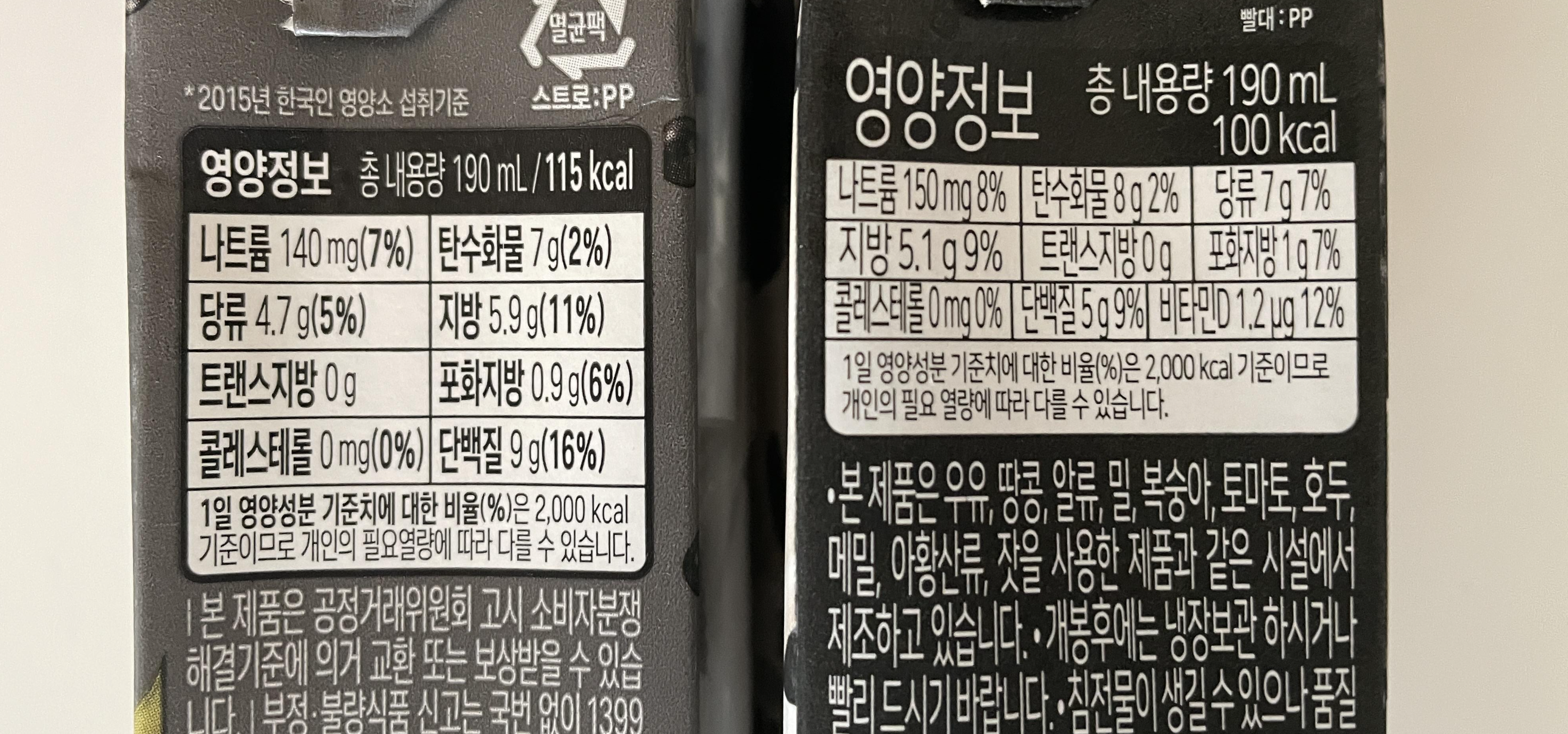 영양소는 단백질, 당, 나트륨을 기준으로 보는데 단백질 함량 차이가 많이 나요. 두유 중에 단백질 함량이 높은 제품을 원하는 사람은 매일 두유 중에 고르면 될 거 같아요. 저는 그냥 두유를 좋아해서 여기저기 먹어보고 있지만 기본에 충실한 제품은 매일 두유. 콩에는 이소플라본이라는 성분이 들어있어서 여성 호르몬이 낮아지기 시작하는 30대부터 챙기면 좋아요.