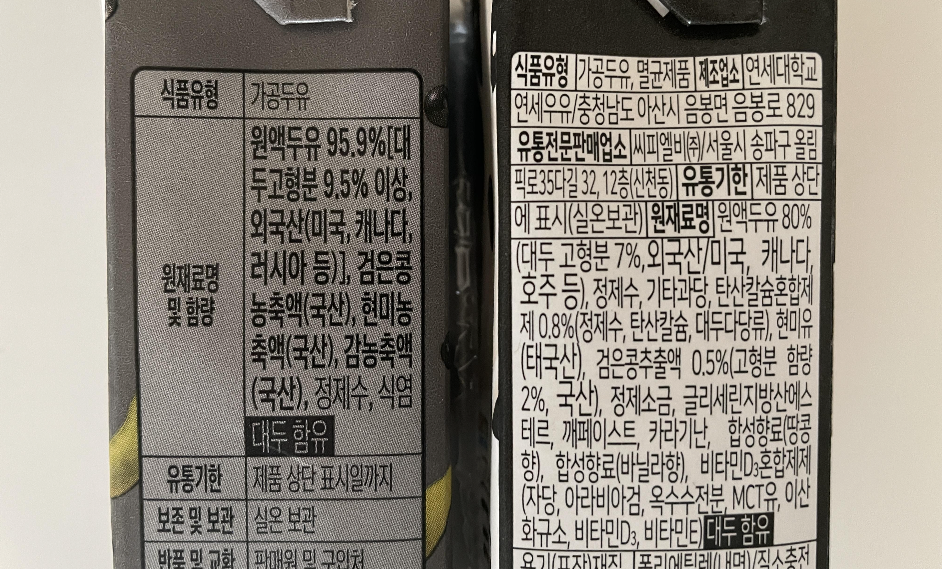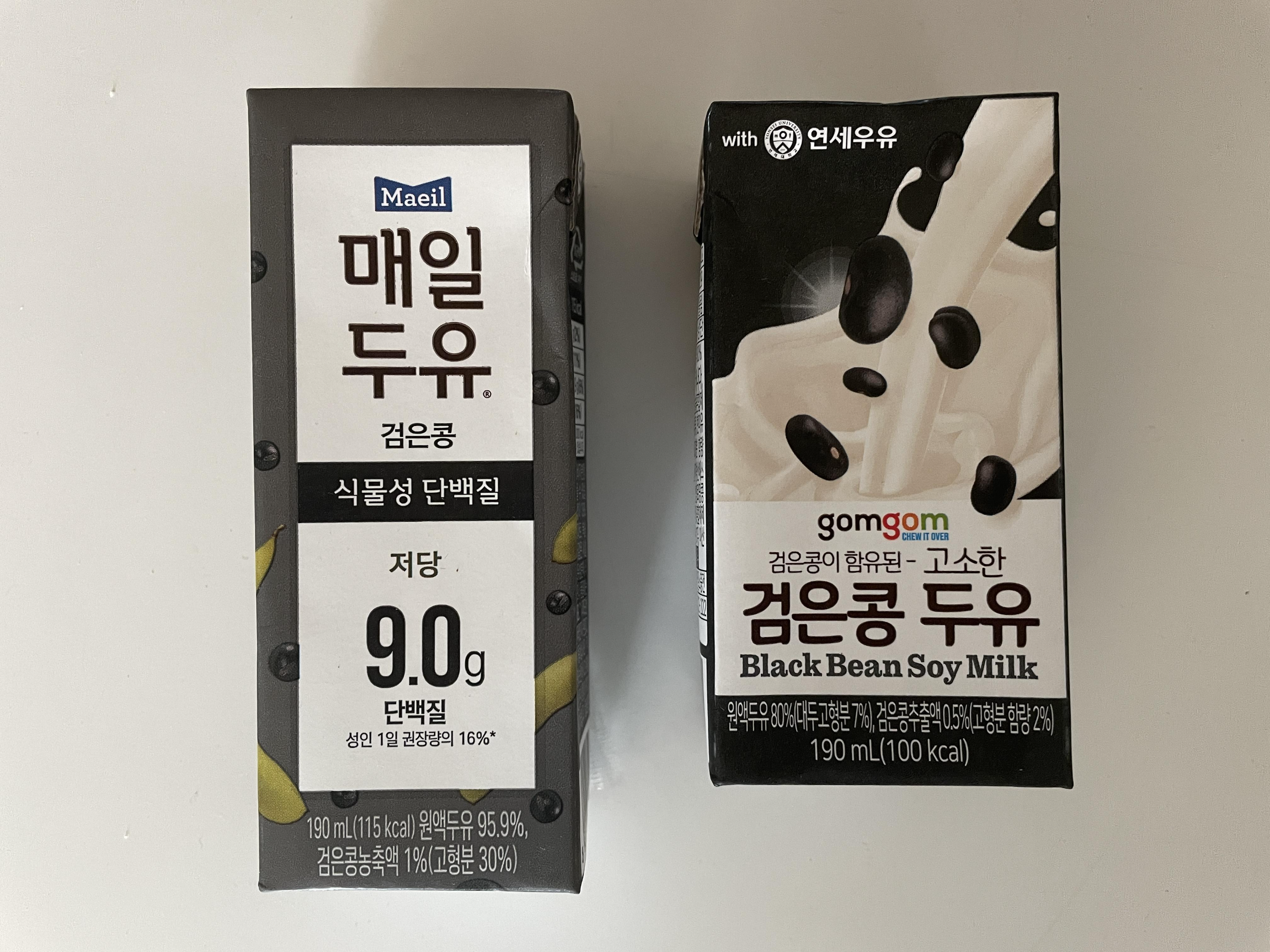 연세우유 gomgom검은콩 두유는 달진 않지만 묽은 느낌의 밍밍한 맛이 나고 매일 두유 검은콩은 콩의 고소한 향이 나고 적당히 든든한 질감이 있어요.