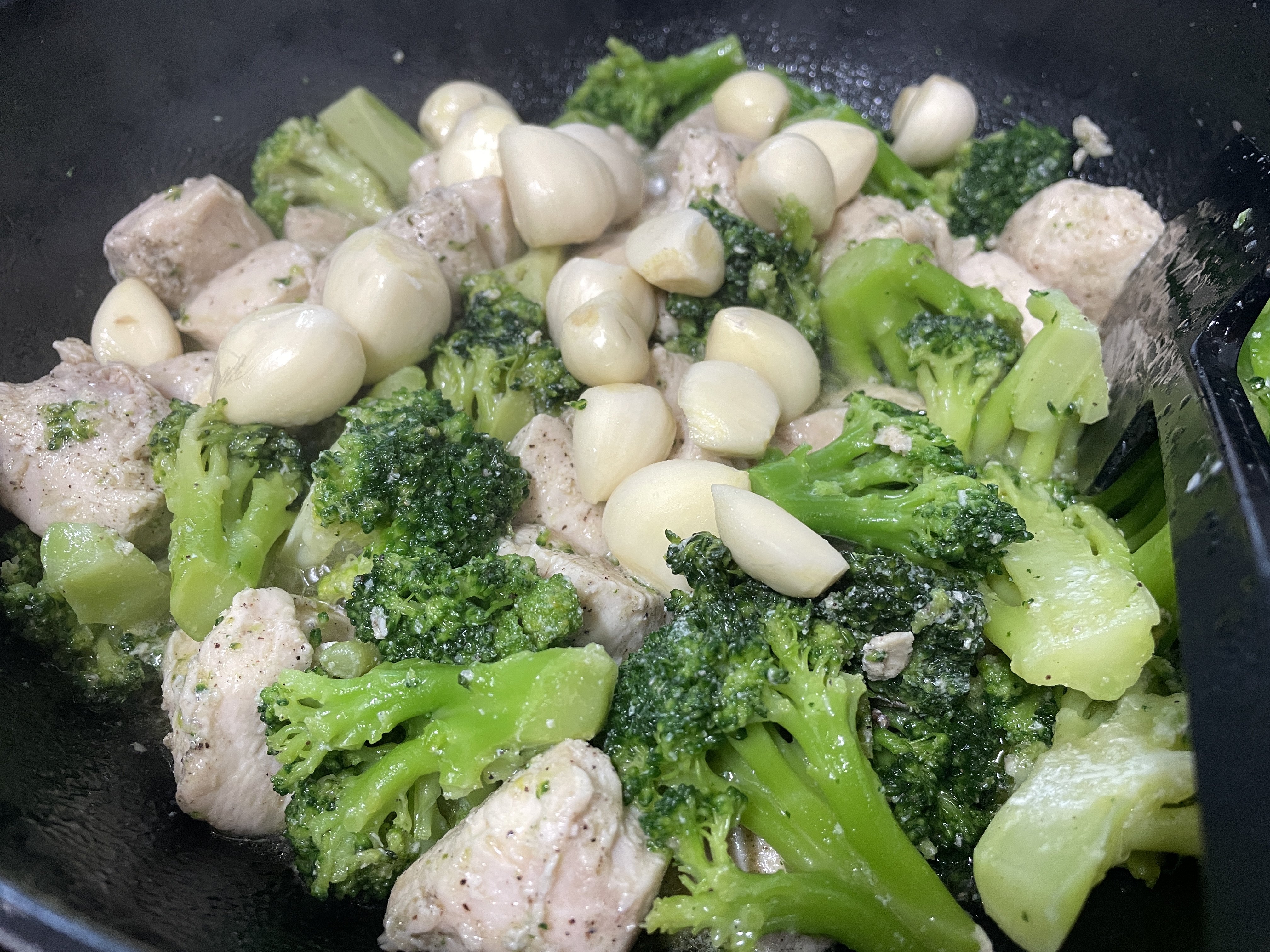 2. 윅에 1을 넣고 적당히 익으면 브로콜리, 마늘을 넣어 함께 노릇노릇하게 볶는다
