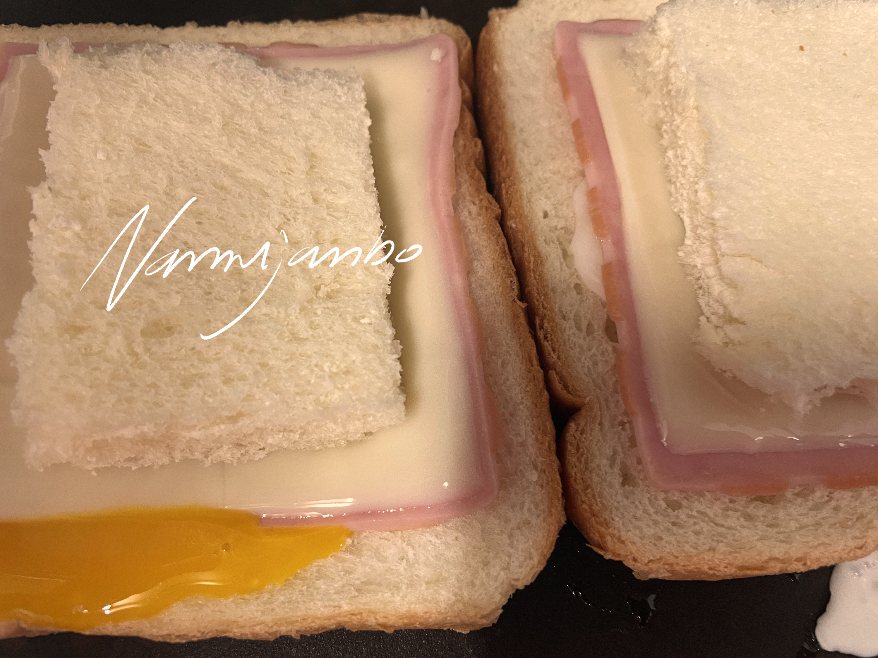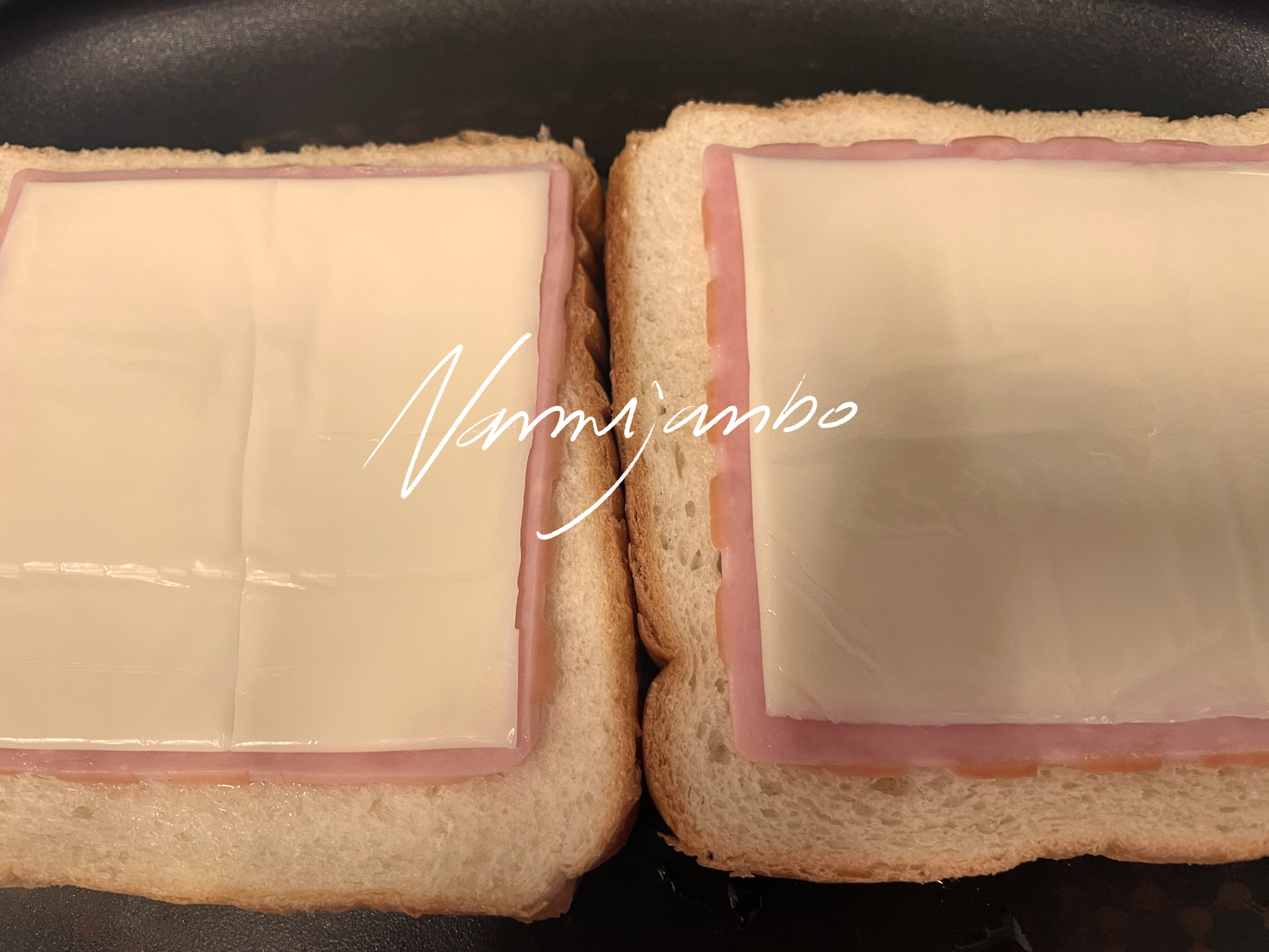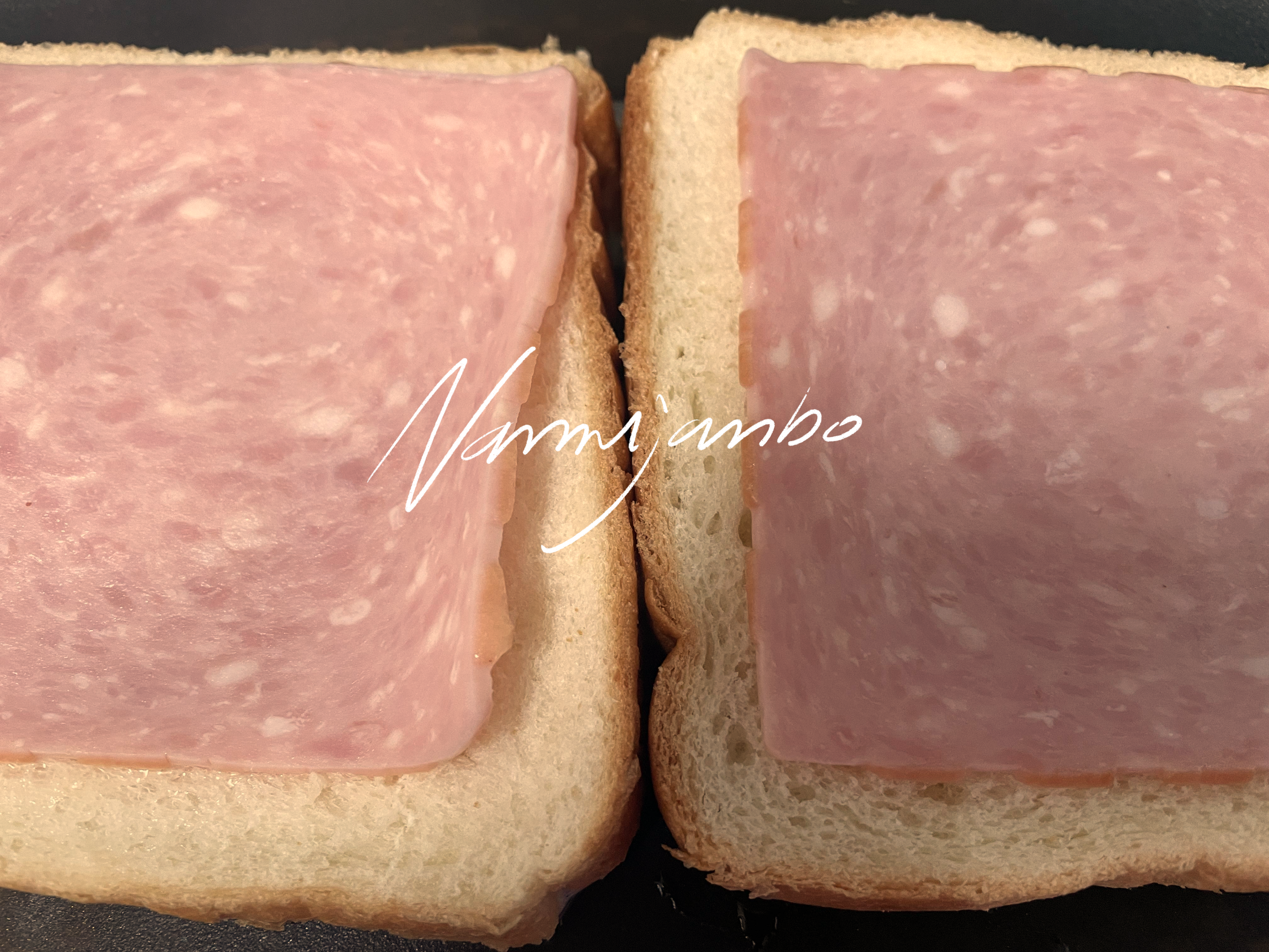 4. 계란 흰자가 하얗게 변하면 햄을 그 위에 덮는다