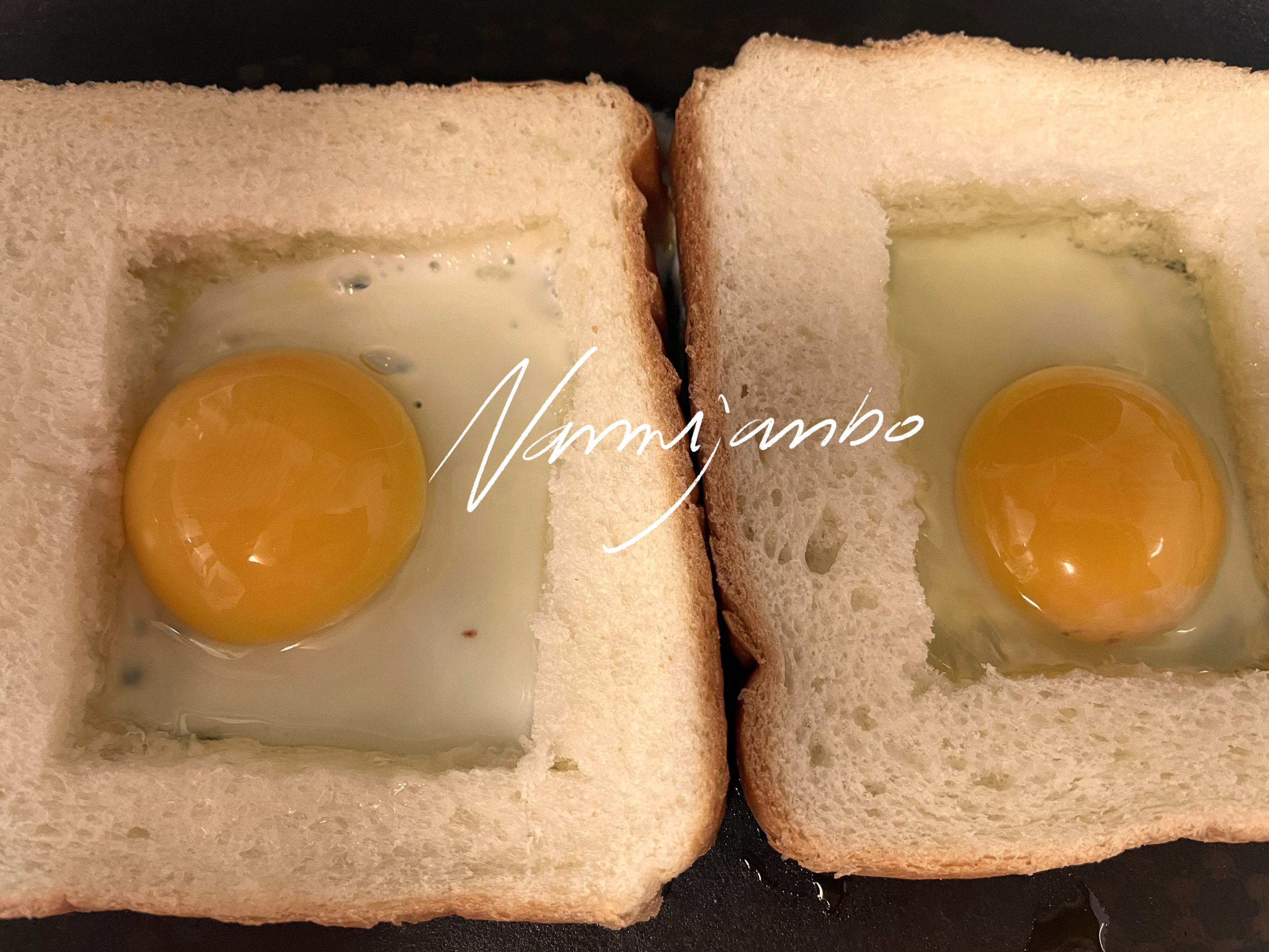 3. 가운데를 내 마음대로 네모로 자른 식빵을 올리고 계란을 하나씩 넣어준다