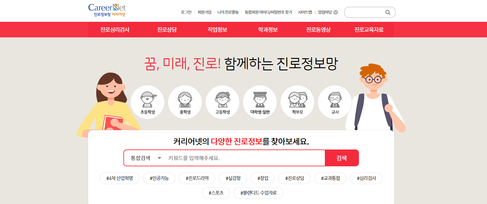 로그인하신 다음에 중, 고등학생과 대학생 진로 심리검사를 진행할 수 있어요