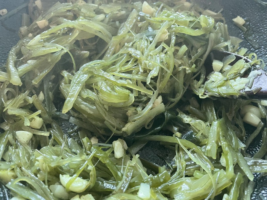 4. 마늘이 반정도 익으면 미역줄거리를 넣고 같이 볶는다.