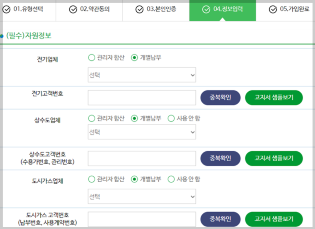 4. 정보입력 / 내가 살고 있는 주소를 적고 전기세, 관리비, 도시가스비 내역을 체크하시면 돼요