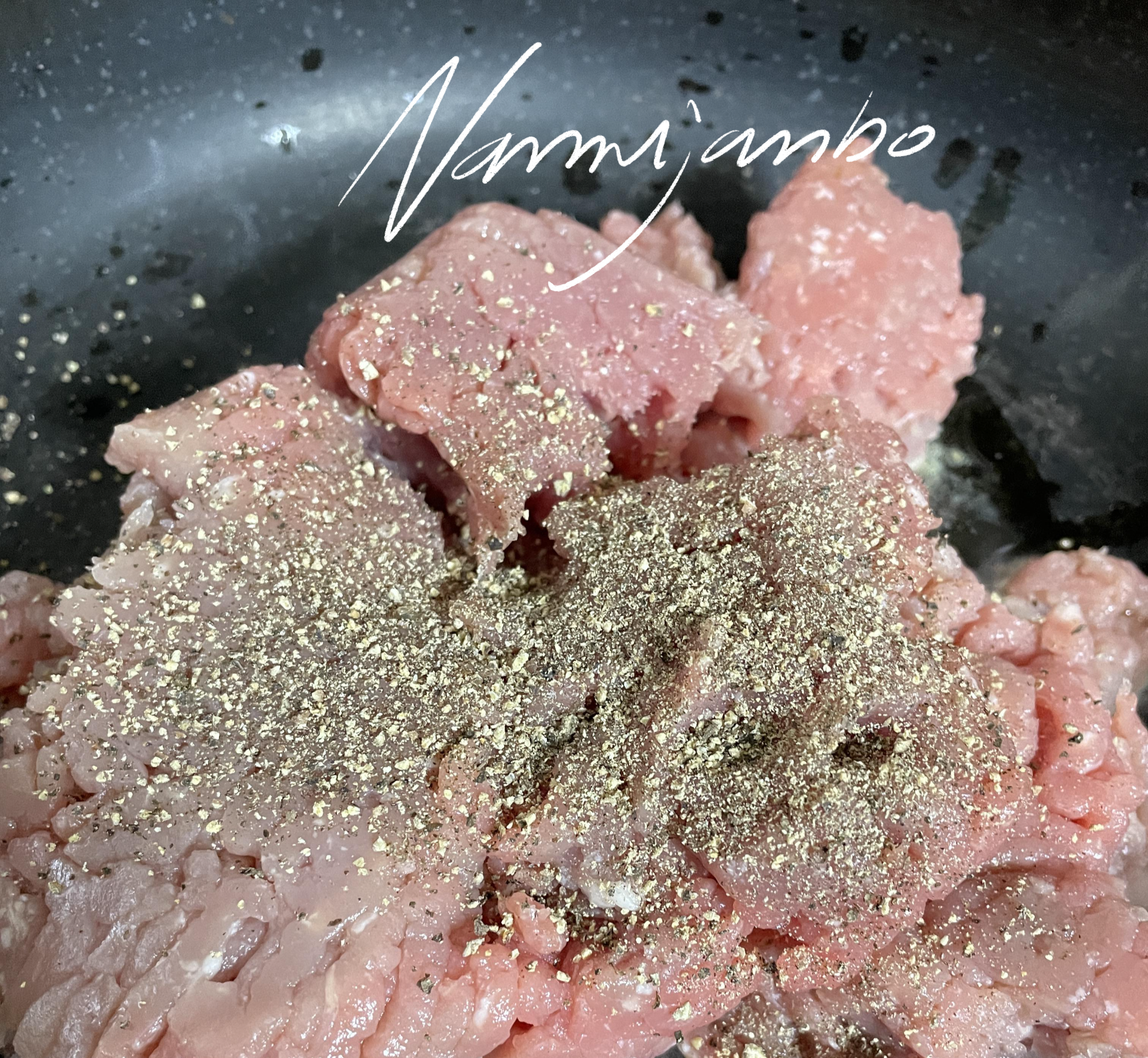 2. 뚜껑 있는 두툼한 냄비에 들기름을 넣고 돼지고기 다짐육, 후추를 넣고 강불에서 익을 때까지 볶는다