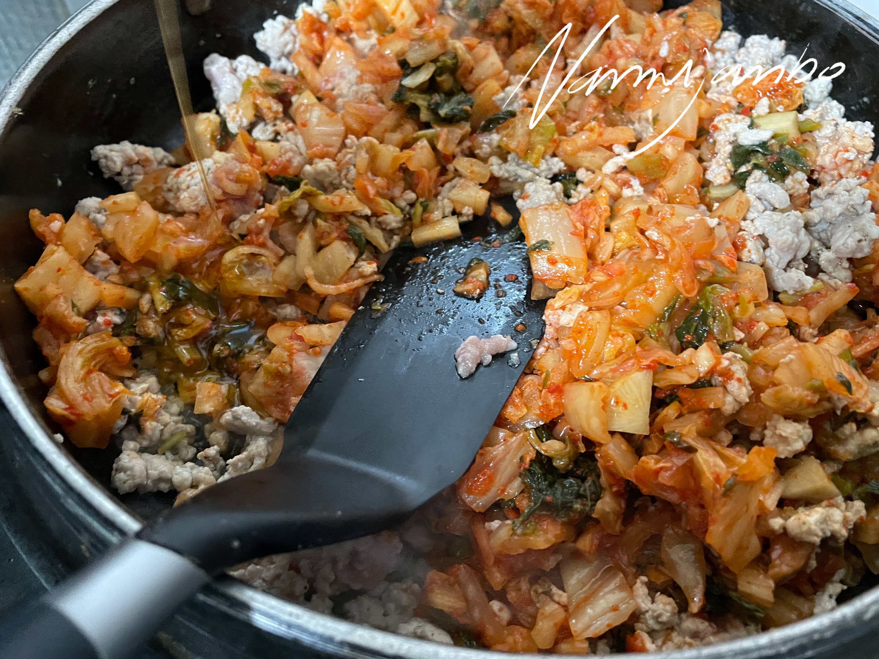 3. 김치를 총총 썰어서 국물을 제외하고 건더기만 넣어 잘 섞일 때까지 볶는다