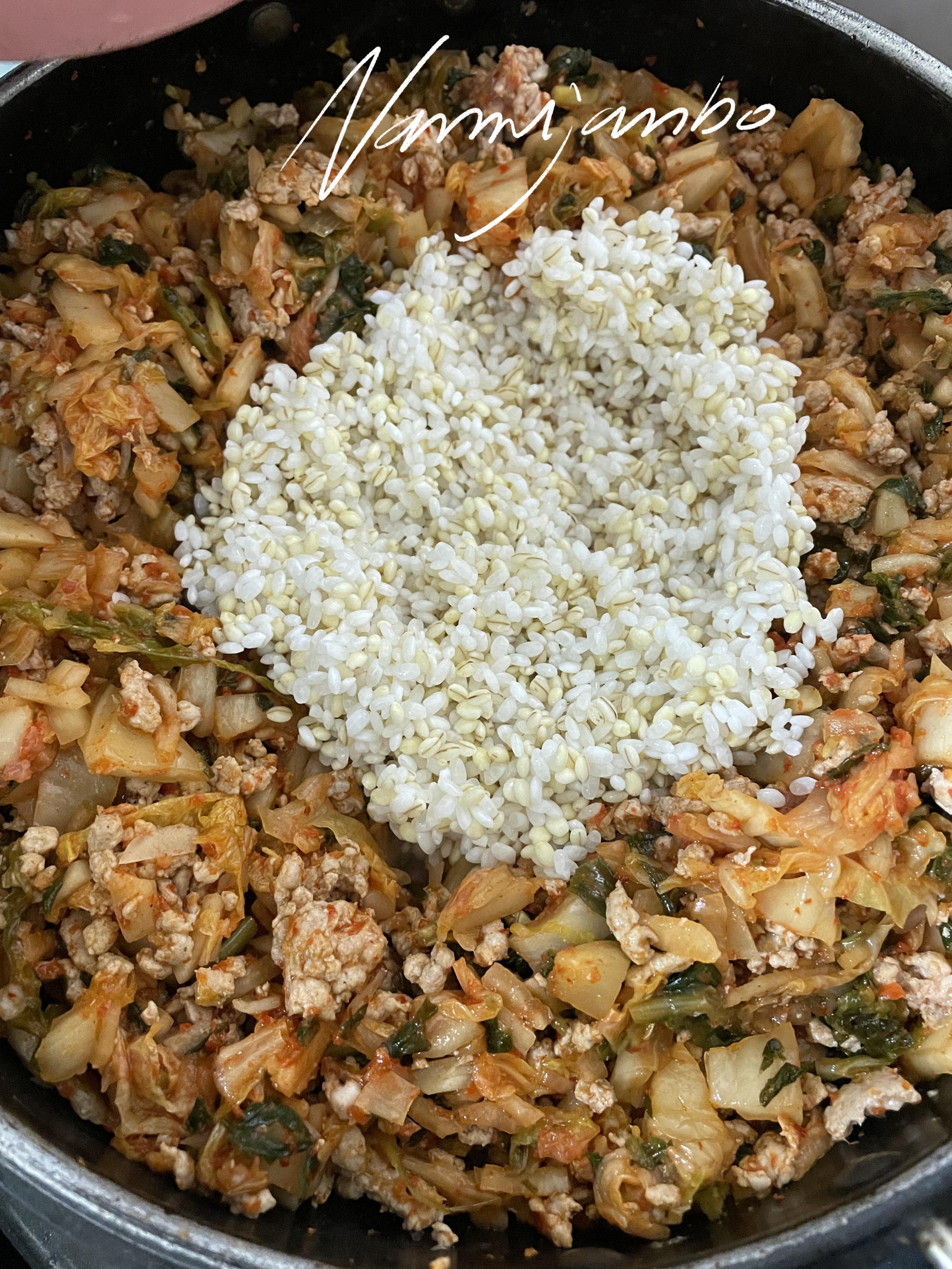 4. 돼지고기김치볶음 가운데 공간을 만들고 불려놓은 백미를 놓는다