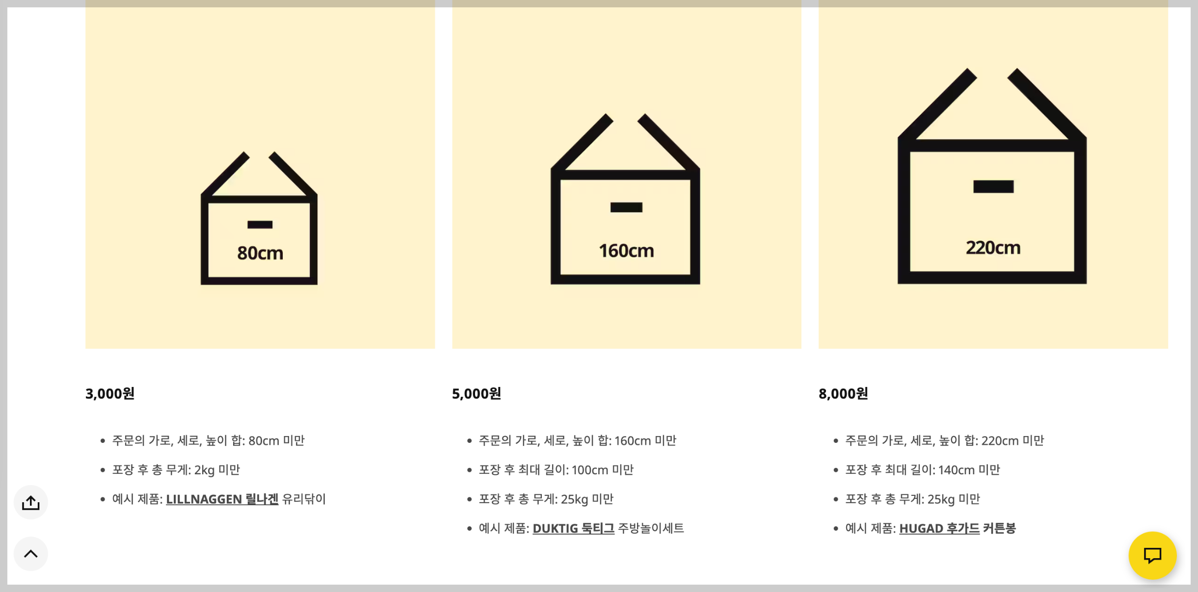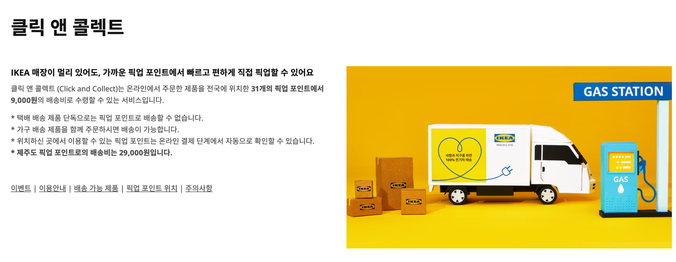 무게와 크기에 따라 가격이 세분화되어 있어서 이케아가 집에 서 가깝다면 직접 가는 것도 좋겠지만 거리가 있다면 인터넷 배송을 이용하거나 클릭 앤 콜렉트 라는 집과 가까운 픽업 포인트에서 물건을 전달받는 서비스를 이용하는 것도 생각해 볼 거 가아요