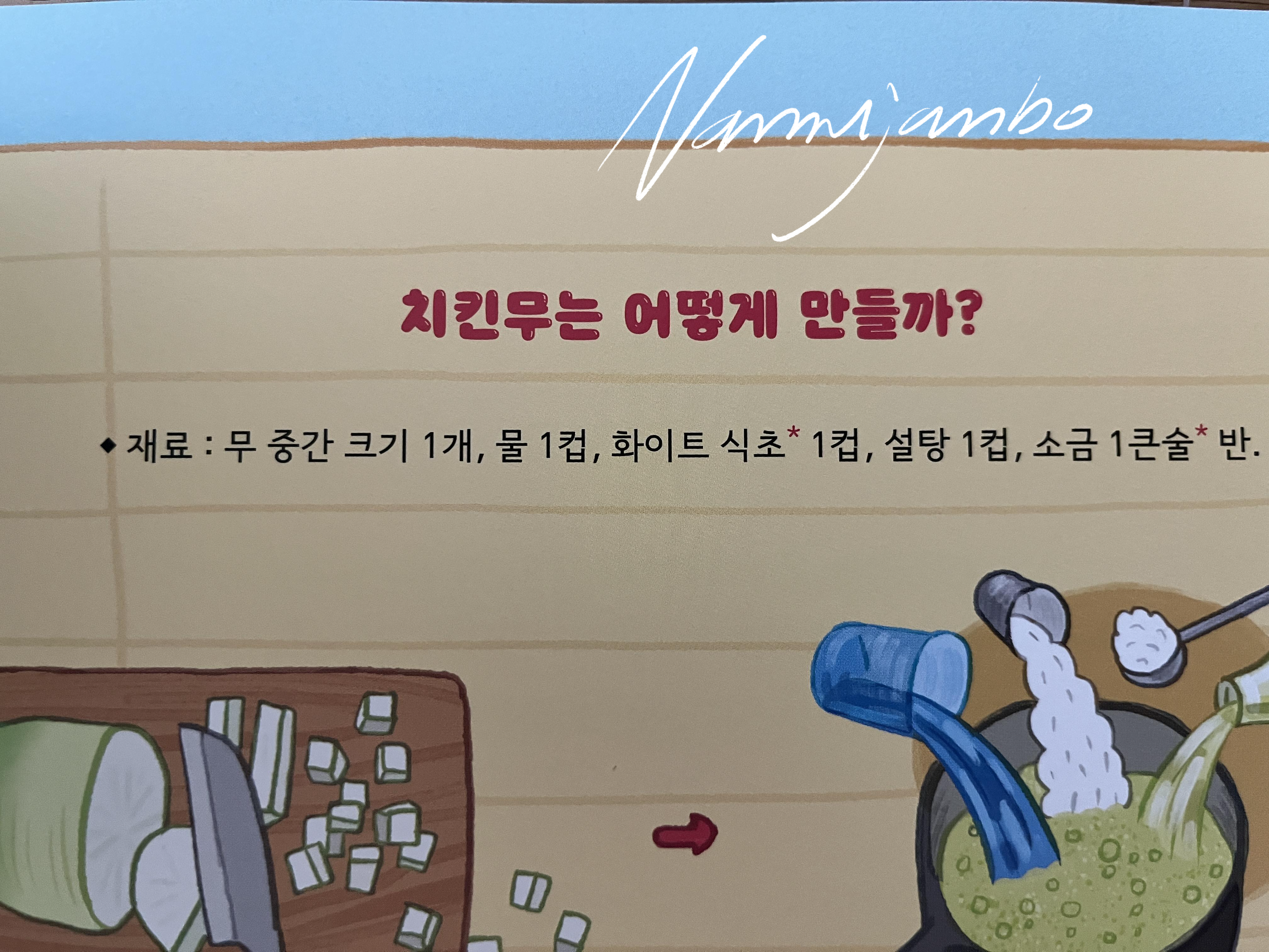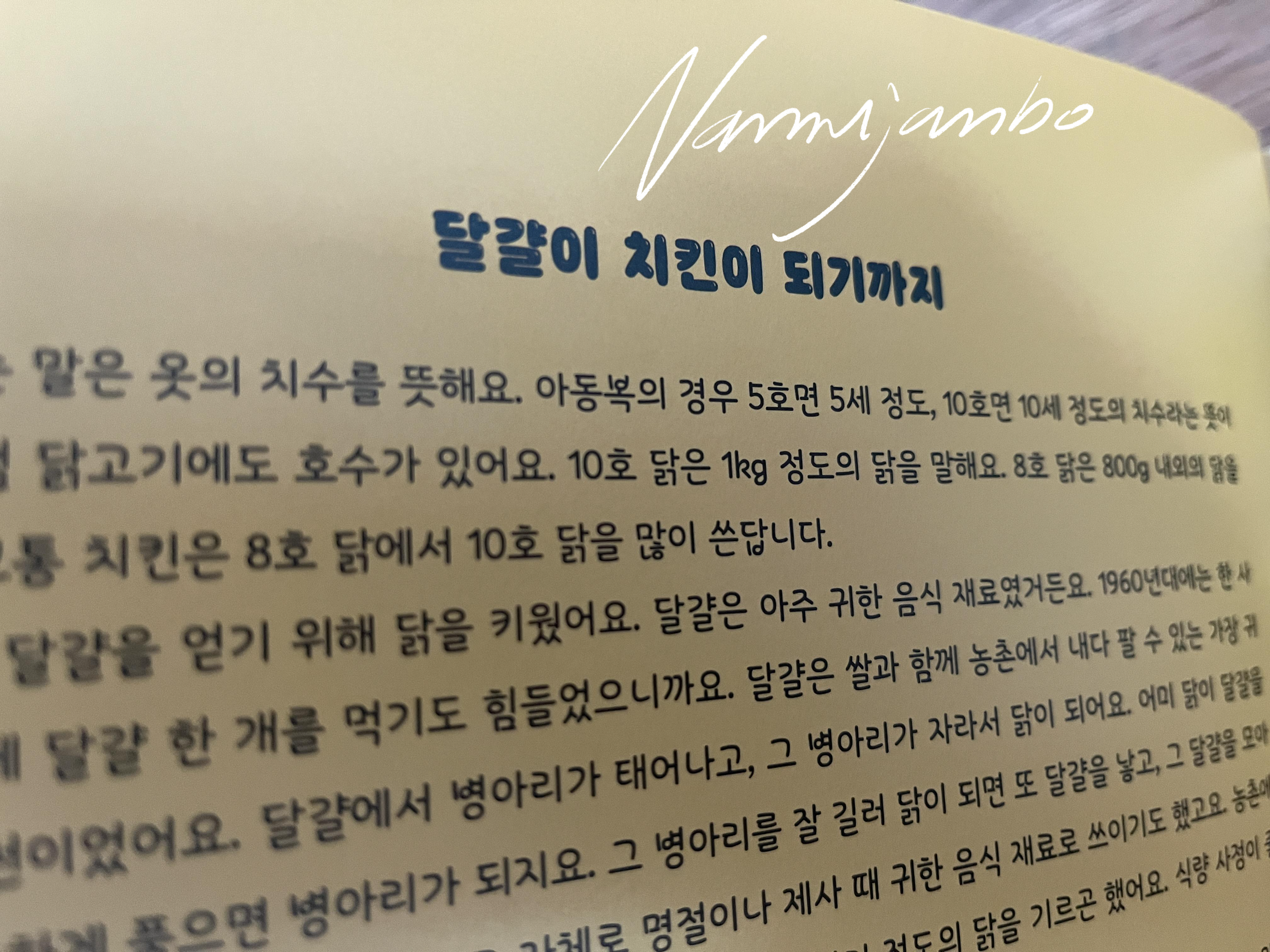 그 외에도 치킨무는 어떻게 만들어지는지 달걀이 치킨이 되는 과정, 치킨의 역사 등등 사소하지만 깊이 있는 이야기가 많이 수록되어 있어요