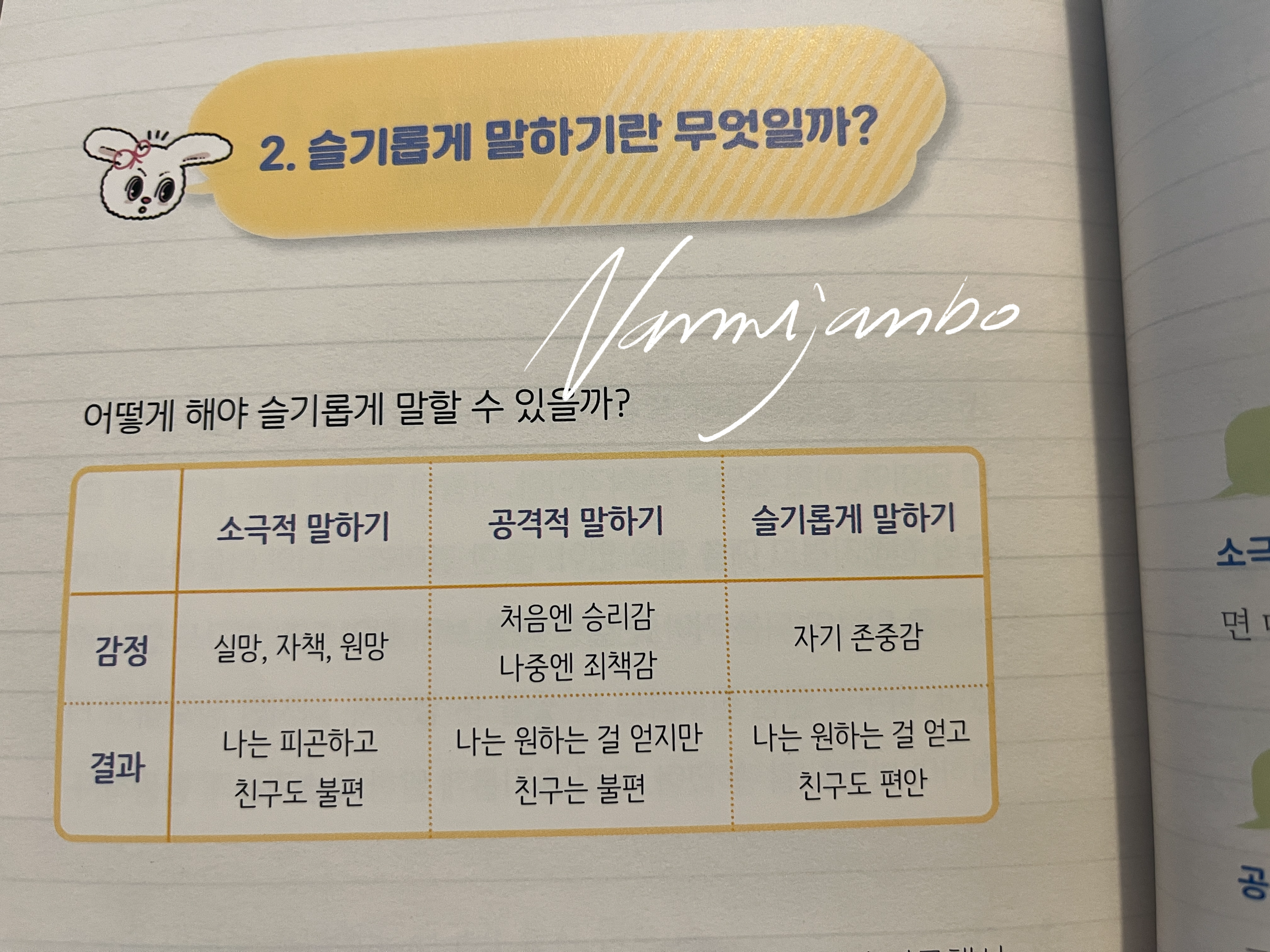 이외에도 친구와 멀어지는 느낌이 들 때, 친구가 허락 없이 내 물건을 가져갈 때, 친구가 부러울 때, 친구가 내 사과를 받아들이지 않을 때, 친구가 대답하기 곤란한 질문을 계속할 때 등등 거절하기, 학교 폭력에 관련된 상황 제시와 올바른 대처방법들이 자세히 나와있어요