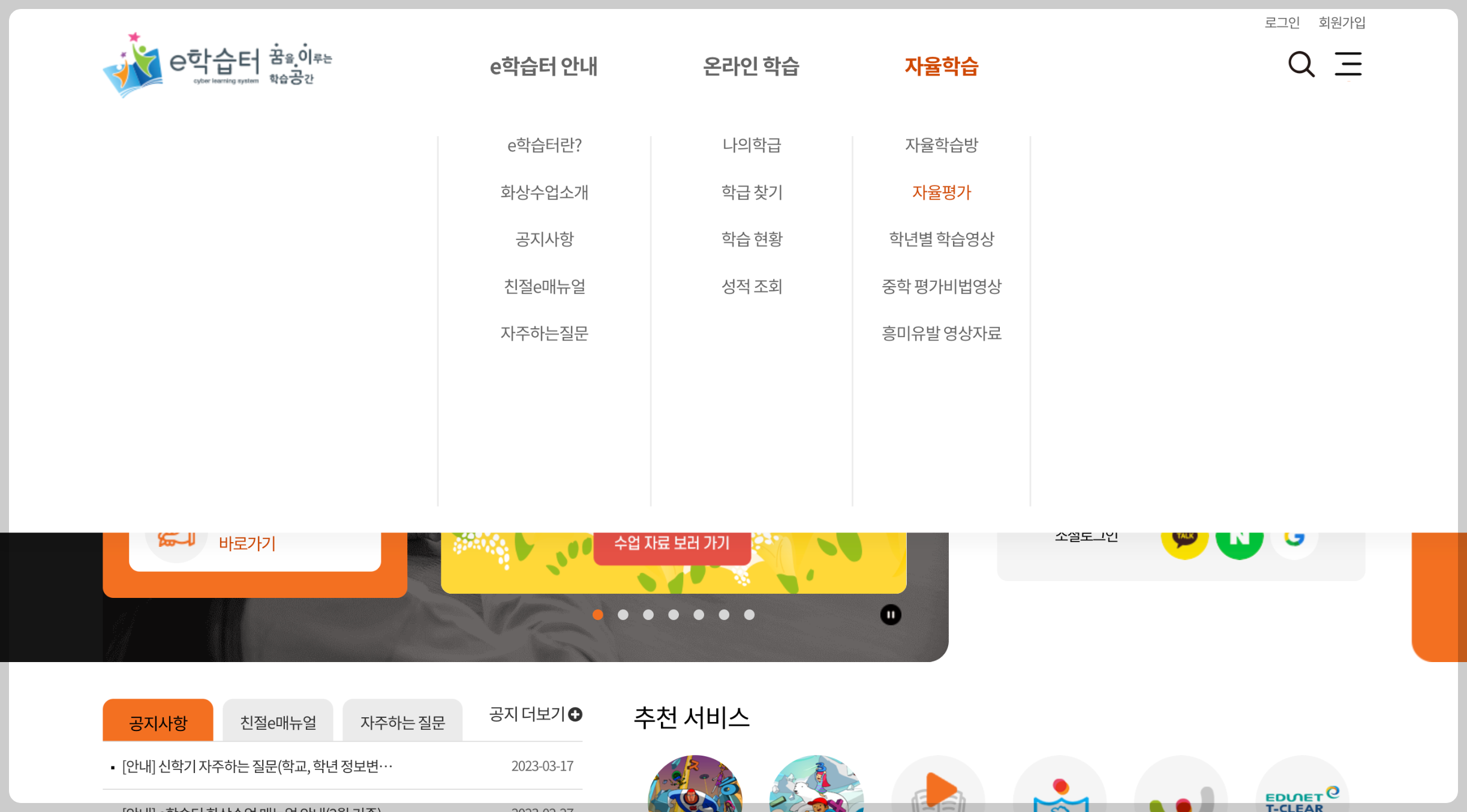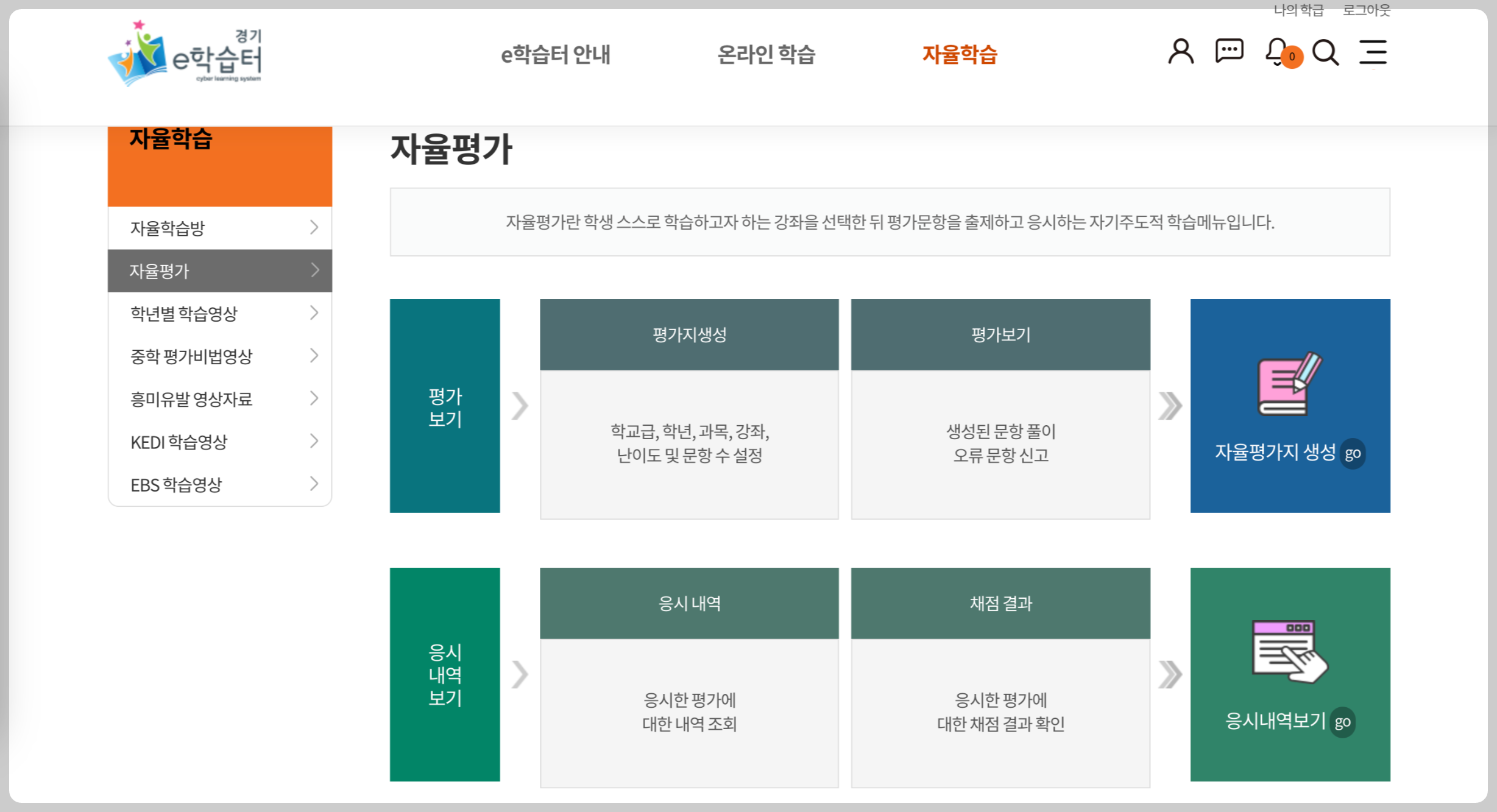 오른쪽 위에 자율학습 클릭 - 자율평가로 들어가시면 돼요