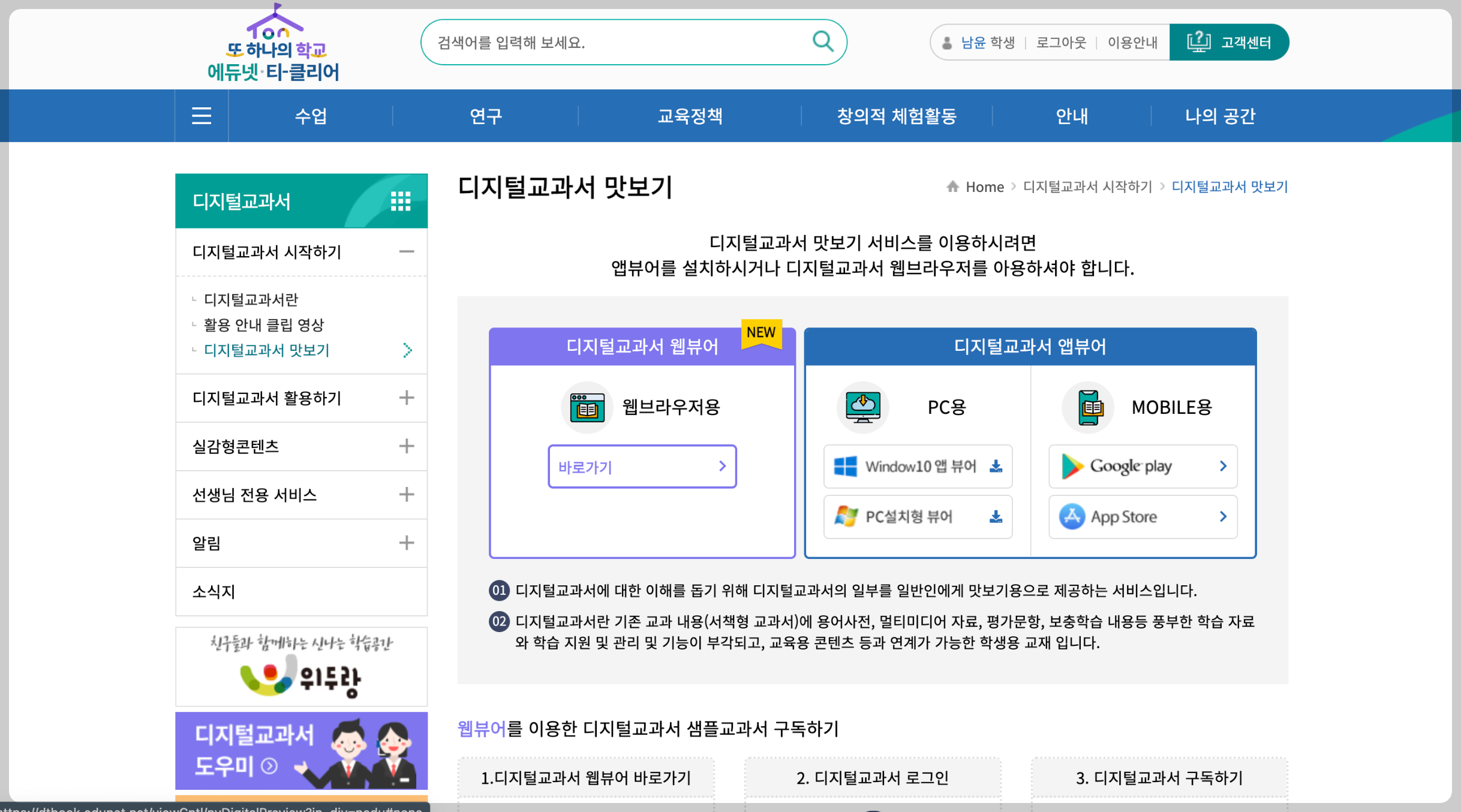 디지털 교과서 웹뷰어- 웹브라우저용 바로가기 클릭