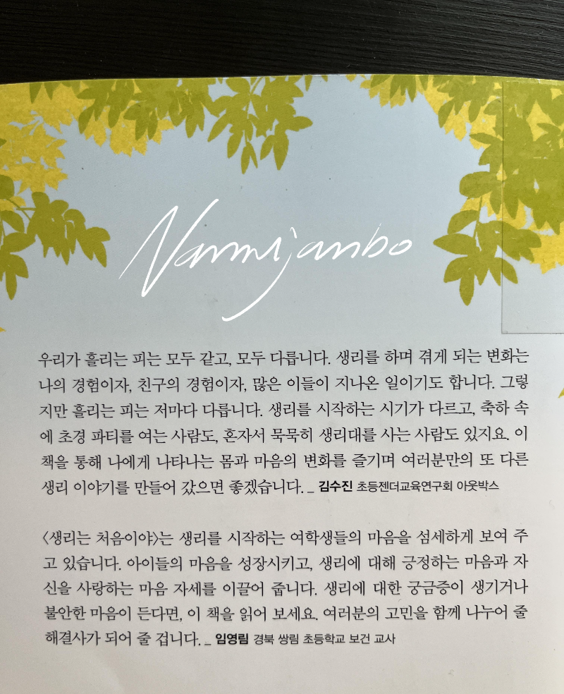 이 책은 이제 생리를 경험하게 될 아이를 위해 골라봤는데요 아주 흥미롭고 재미있게 읽어서 공유합니다 이제 슬슬 사춘기에 접어든 아이라 그런지 굉장히 관심 있게 읽고 더 많은 지식을 궁금해하더라고요 아이가 책을 읽고 난 후 생리하면 배가 아프다고 하는데 왜 그런 지서부터 질문이 끊임없이 이어져서 아이가 이해하기 쉬우면서 좀 더 전문적인 책을 알아봐야겠어요