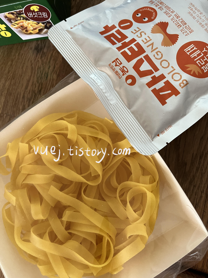 볼로네제, 버섯크림 두 종류 구매했는데 둘이서 반씩 나눠 먹으면 좋을 거 같더라고요 아침에 현관에 배송완료 - 주말 아침 식사 메뉴로 당첨!