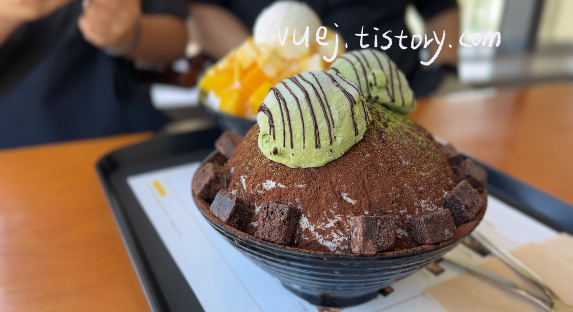 사람들로 가득 이미 여름인거죠 아이들이 좋아하는 애플망고치즈설빙, 그린티초코설빙. 망고 좋아하는 사람은 망고 쪽, 초코녹차 좋아하는 사람은 초코 쪽 -