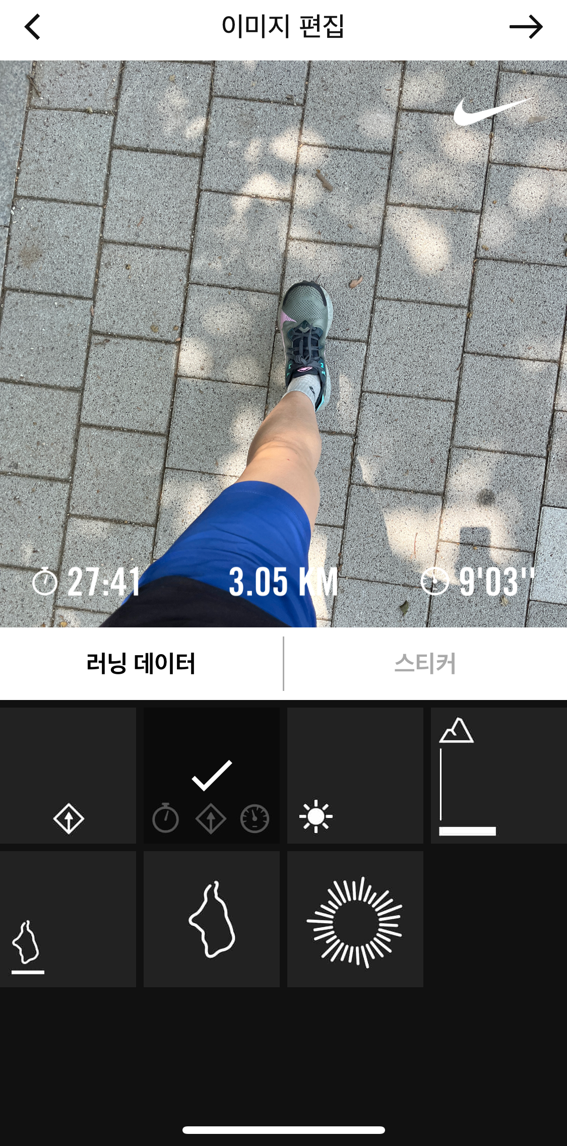 러닝 데이터 디자인도 이쁘고 스티커도 막 집어넣어서 내 마음에 드는 나이키러닝샷 만들어서 저장 가능해요 바로 자신의 SNS로 바로 보낼 수 도 있어요