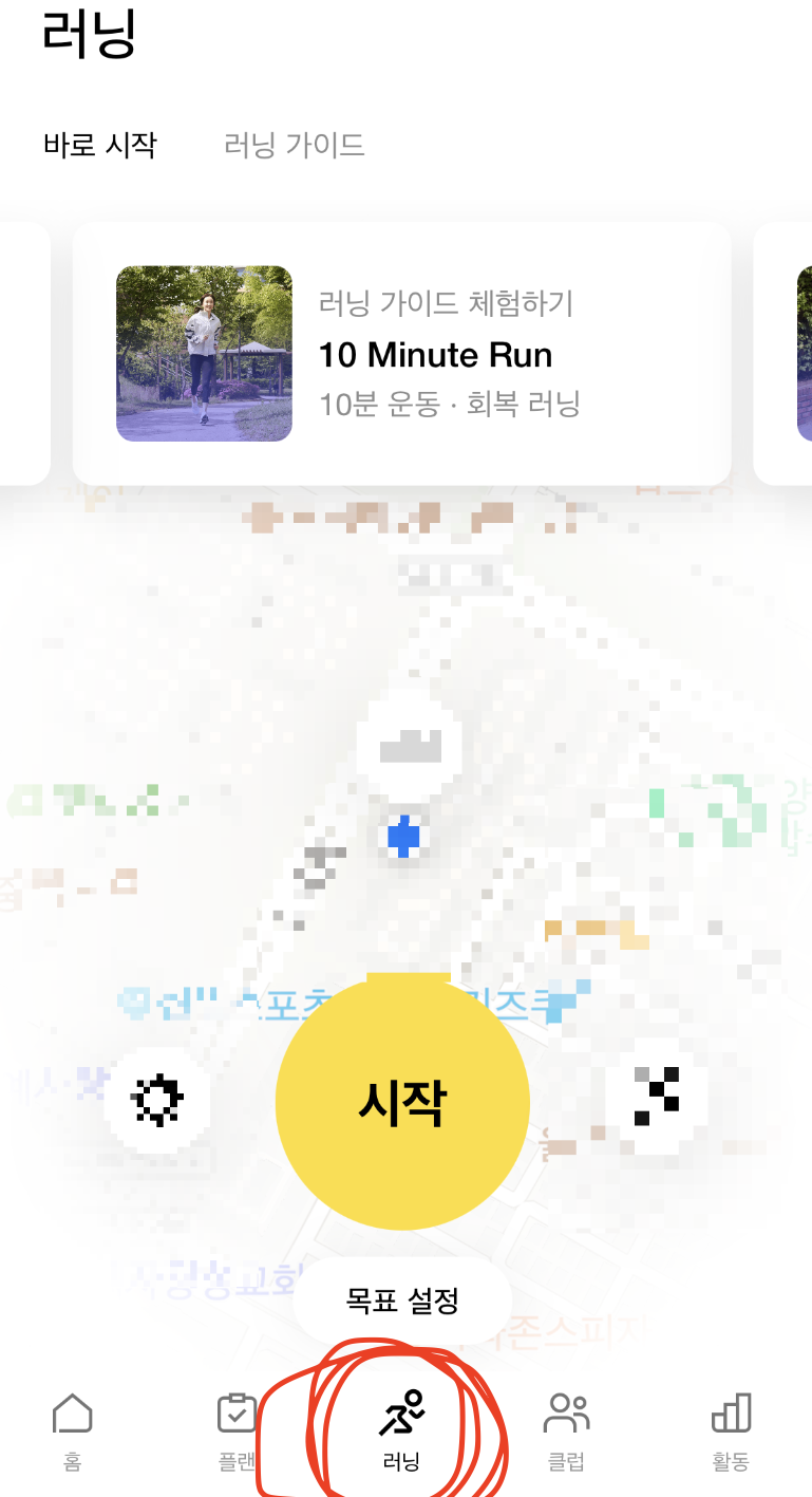 내 마음에 드는 러닝 가이드 체험하기를 클릭한 다음 운동 시작하거나 잘 모르겠다 싶으신 분은 그냥 노랑이 시작 누르고 운동을 시작하셔도 돼요