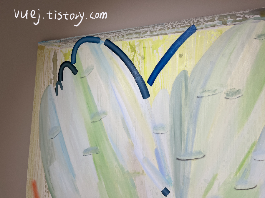 위 작업은 아크릴 물감인 줄 알았는데 유채! 가까이 보면 뭉개진 느낌인데 멀리 떨어져서 보면 사진 조각을 오려서 구성한 세련된 꼴라쥬 같은 느낌이 나더라고요