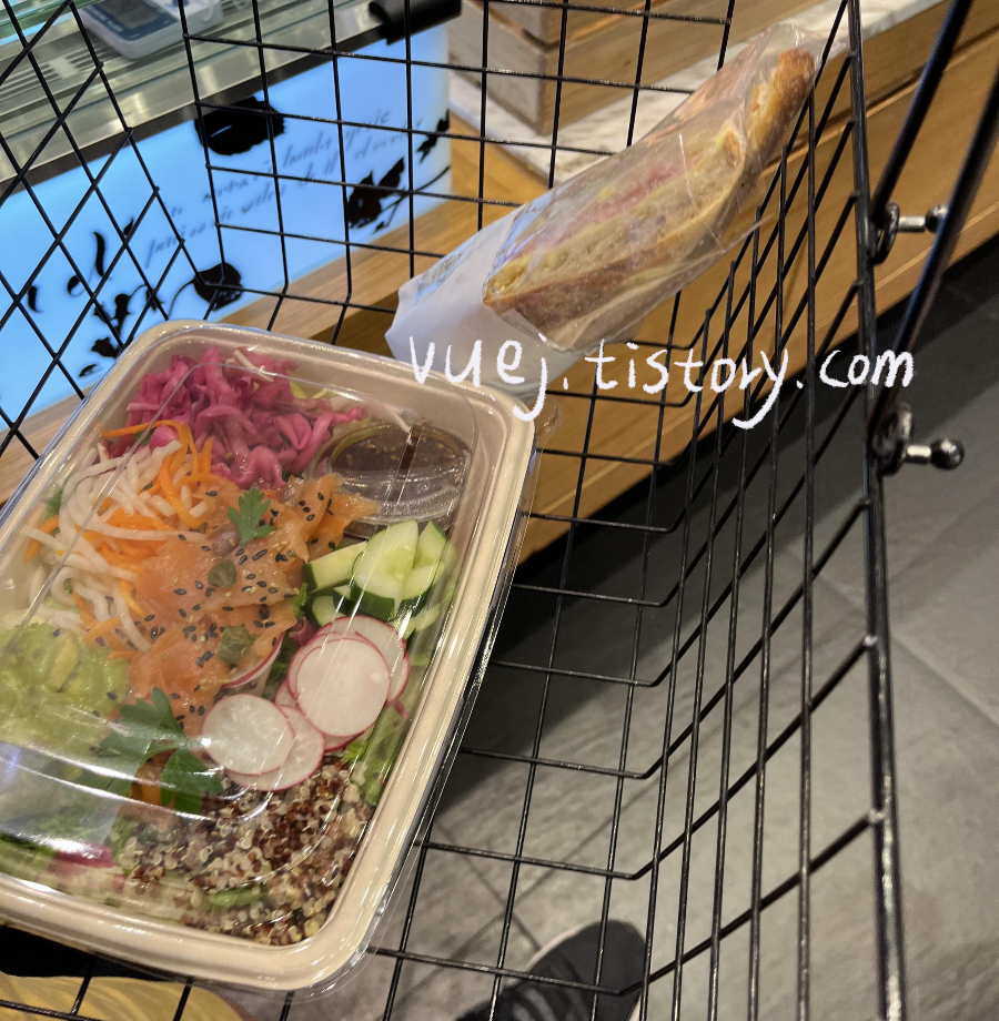 샐러드, 샌드위치, 브런치 메뉴가 다양해서 좋다 브런치를 선택하면 음료와 함께 즐길 수 있고 통신사 skt, kt, lg u+ 모두 할인도 가능하다 우리는 연어샐러드와 잠봉뵈르 바게트 샌드위치 선택 연어 샐러드는 보통의 맛, 잠봉뵈르는 나에게 너무 짜다 - -