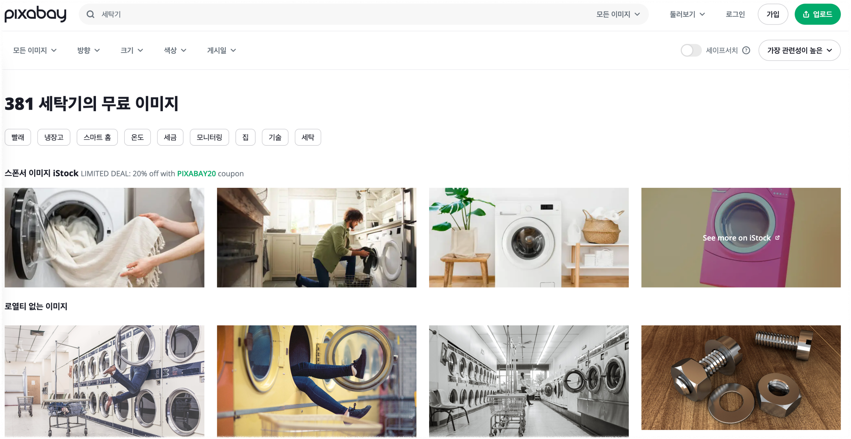 저는 세탁기 이미지가 필요해서 메인 검색창에 '세탁기'라고 쳤더니 스폰서 이미지와 로열티 없는 무료 이미지가 구분되어서 나오더라고요 무료 이미지를 원하면 아래 로열티 없는 이미지에서 고르시면 됩니다.
