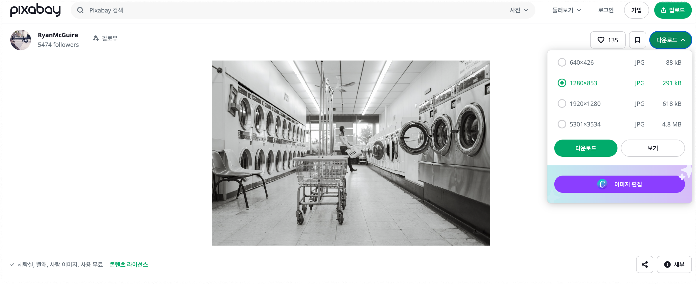 로열티 없는 이미지 중에서 원하는 이미지를 클릭해서 들어가면 다운로드 버튼이 오른쪽 위에 있어요. 클릭하시면 이미지 형식과 사이즈를 고를 수 있고 다운로드하시면 되요. 간단하죠?