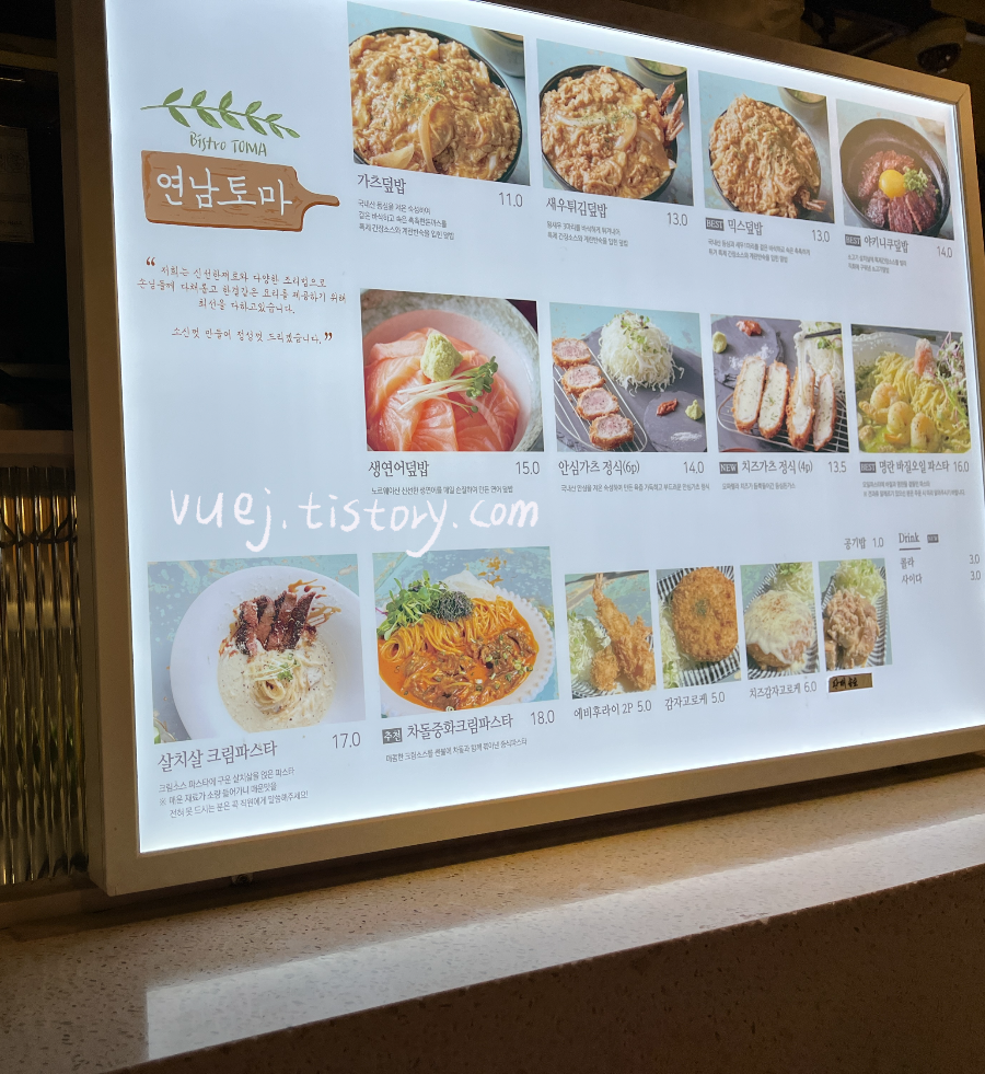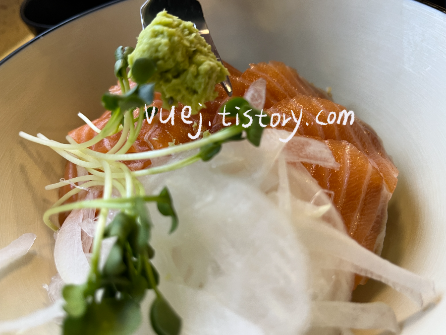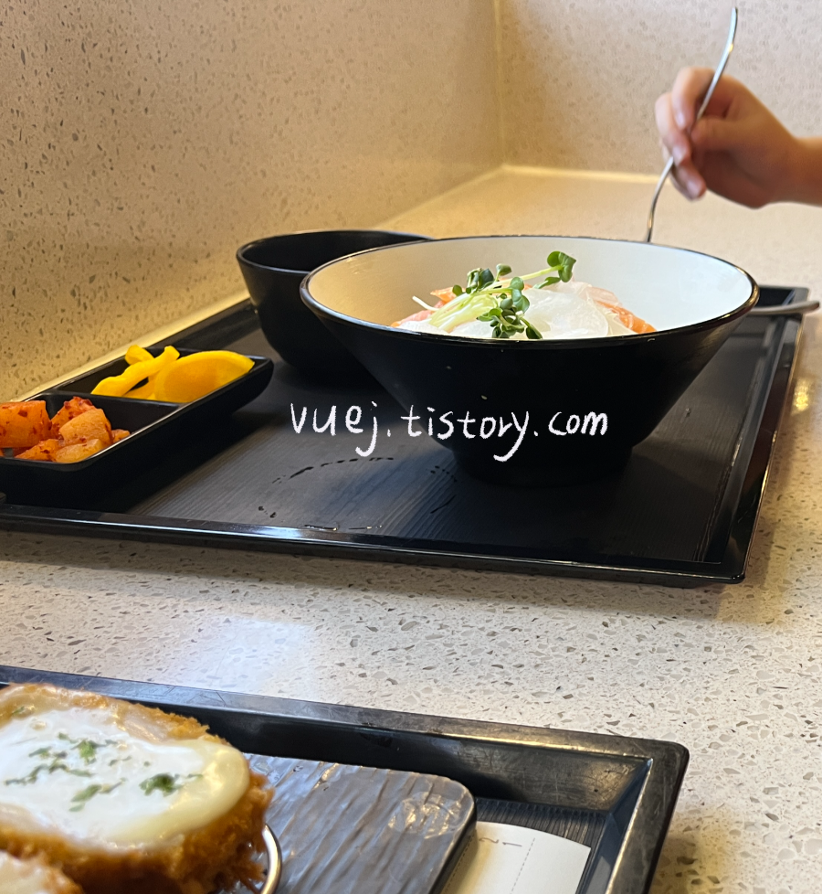 아이는 생연어덮밥, 저는 치즈돈가스를 먹었어요