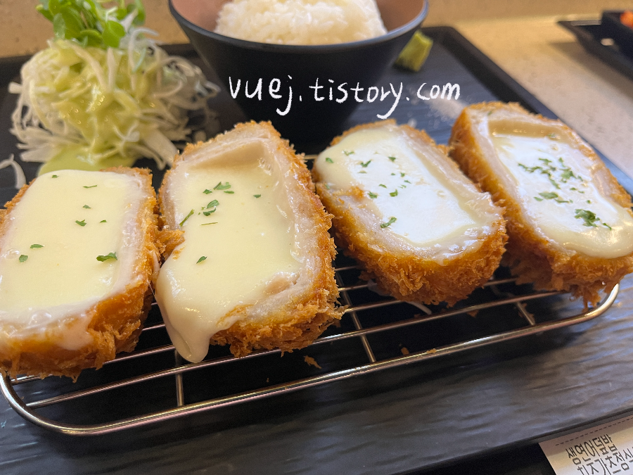 치즈돈가스는 4조각이라 이걸 먹고 과연 배가 부를까? 의심스러웠지만 다 먹고 나서 저는 양이 딱 좋았어요 (개인적으로 배가 부른 걸 별로 안 좋아하데 되었어요. 배가 부르면 기분이 안 좋아지는 나이에 도달한 것이 아닌가 싶어요 - - ) 치즈돈가스에 치즈만 들어있는 것이 아니더라고요. 고기도 얇게 들어가 있어서 식감도 좋고 든든하고 일단 짜지 않아 좋았어요. 조금 느끼하다 싶을 때 생고추냉이와 소금을 곁들여 먹는 것을 추천.