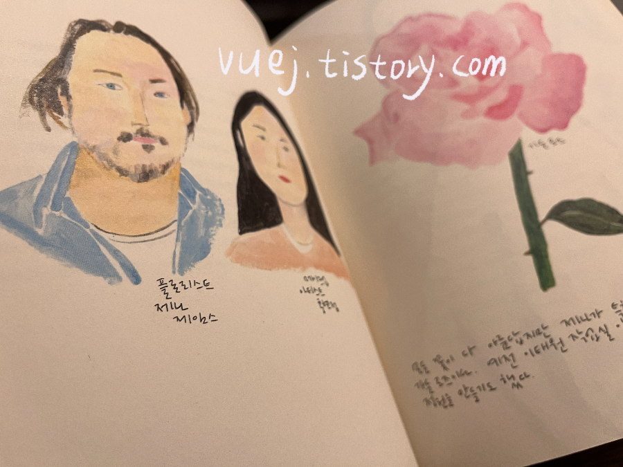 따라 그리고 싶을 만큼 아름다운 그림들이 많은 책을 발견했어요. 주변사람들의 인물 그림들과 함께 그들을 생각하면 떠오르는 식물을 같이 그려 넣었어요. 짤막한 이야기도 같이요. 저처럼 드로잉에 관심 있는 분들은 유심히 볼 포인트들이 아주 많더라고요. 기분 좋아지는 그림들이에요.