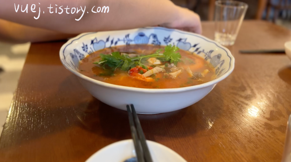 드디어 궁금했던 똠양꿍. 너무 맛있었어요. 비가 와서 더 그런지 계속 국물에 숟가락이 가더라고요. 고수도 적당히, 향도 적당히 이국적이어서 처음 똠양꿍 시도하시는 분에게 추천합니다.