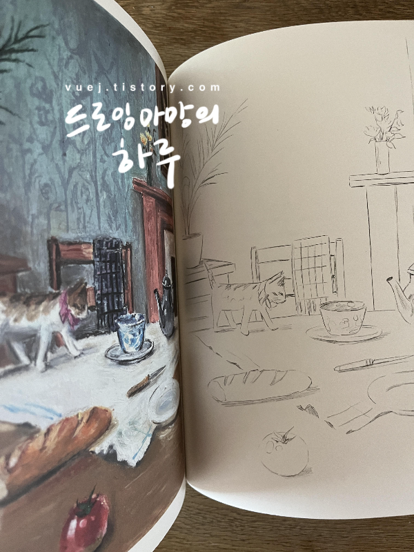 뒤편에는 따라 따라 그릴 수 있게 스케치되어 있는 페이지와 완성된 그림이 같이 있어서 앞부분을 마스터하신 분은 도전해서 그려보시고 다 그린 그림을 액자에 잘 걸어놓으셔도 이쁠 거 같아요.