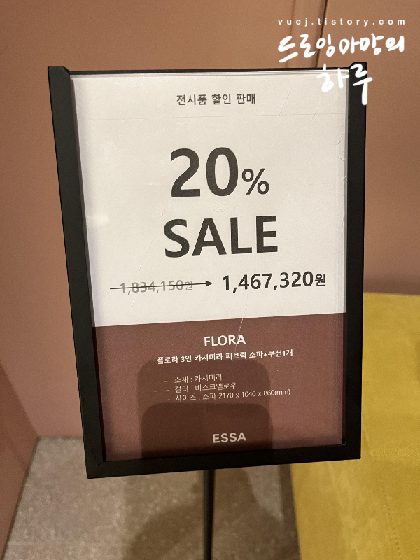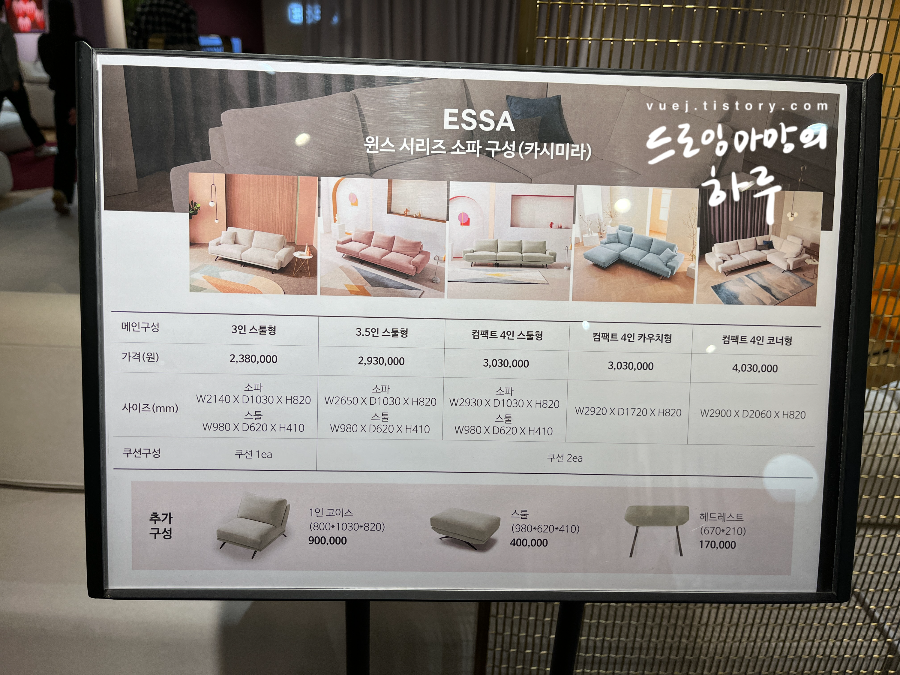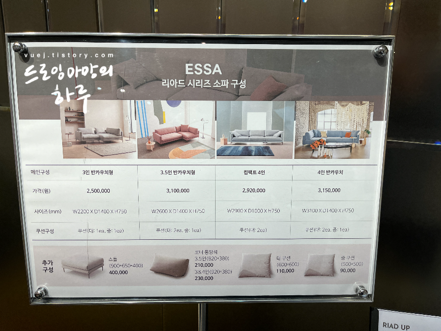 소파는 대부분 제품이 가죽, 패브릭 선택해서 구매가능한 시스템이에요. 주로 전시는 패브릭 위주로, 자코모가 가죽 위주의 소파 브랜드라면 에싸는 패브릭 위주의 브랜드라고 생각하시면 될 거 같아요. 개인적으로 가죽으로 만들어진 에싸 소파는 이쁘다는 생각이 잘 안 들더라고요. 한번 구경해 보세요.