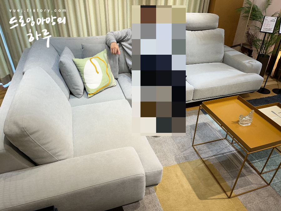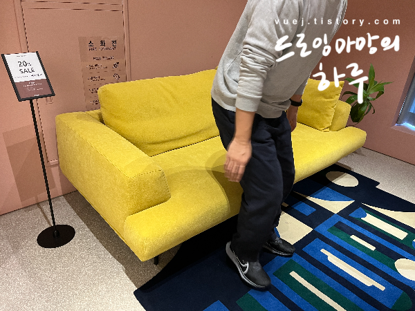구석에 있어서 그냥 앉아봤는데 착석감이 훌륭해서 놀랐어요. 가격도 저렴하고 소재도 좋아 기억해 두기로 했어요. 저 엘로우 제품은 쇼룸에 전시되어 있는 것이라 저렴에서 판매. 온라인/ 새 제품은 40만 원 정도 더 주셔야 해요.