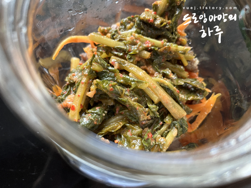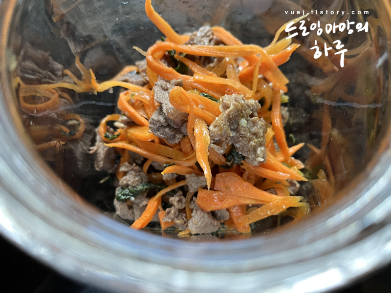 3. 내가 같이 먹고 싶은 재료를 넣으면 되는데요. 저는 볶은 당근, 남은 불고기, 열무김치를 넣었어요. 집에 있는 야채통조림, 육포(잘게 잘라서), 불고기나 볶은 다짐육 등 기호에 맞게 넣어보세요.