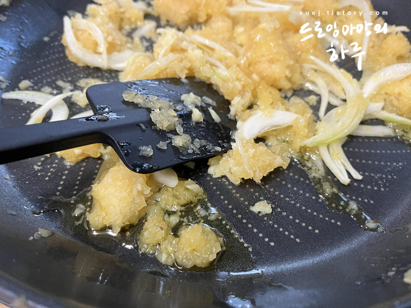 2. 믹서로 간 마늘과 양파를 프라이팬에 넣고 집에서 사용하는 기름을 두르고 중간불로 누릇누릇해질 때까지 볶아요.