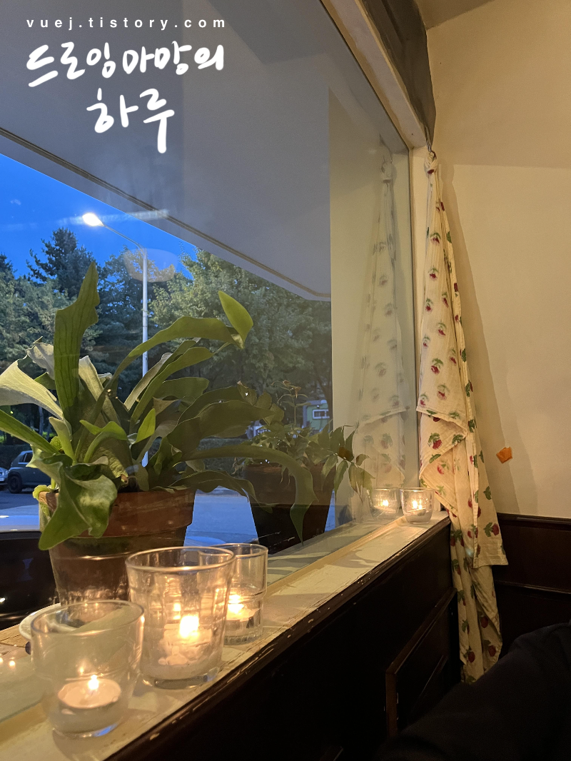 천천히 식사를 하면서 대화하는 동안 서서히 해가 지면서 실내에 켜둔 초가 기분 좋게 빛나요.