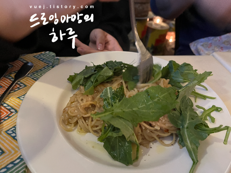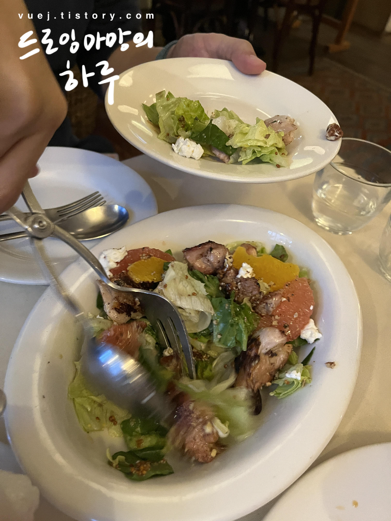 엔초비 파스타, 치킨샐러드, 라쟈냐, 양파수프 등 하나식 주문해서 다양한 음식을 골고루 맛보았어요. 치킨 샐러드는 닭가슴살이 아니고 닭다리살이라 말캉하고 부드러운 식감이 샐러드로 좋더라 고요.