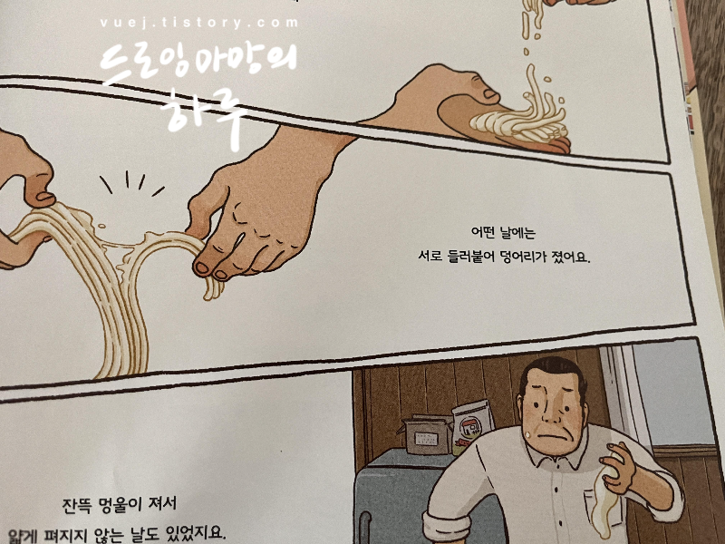 이 책을 보고 나도 한번 라면을 만들어 보고 싶다고 말하는 아이가 있다면 라면 대신 손칼국수나 수제비를 한번 같이 만들어보는 건 어떨까요? 아이와 부모가 함께 방법을 찾아보고 힘을 모아 그럭저럭 맛있는 음식을 만들어 낸다면 아이에게 좋은 경험이 될 거예요.