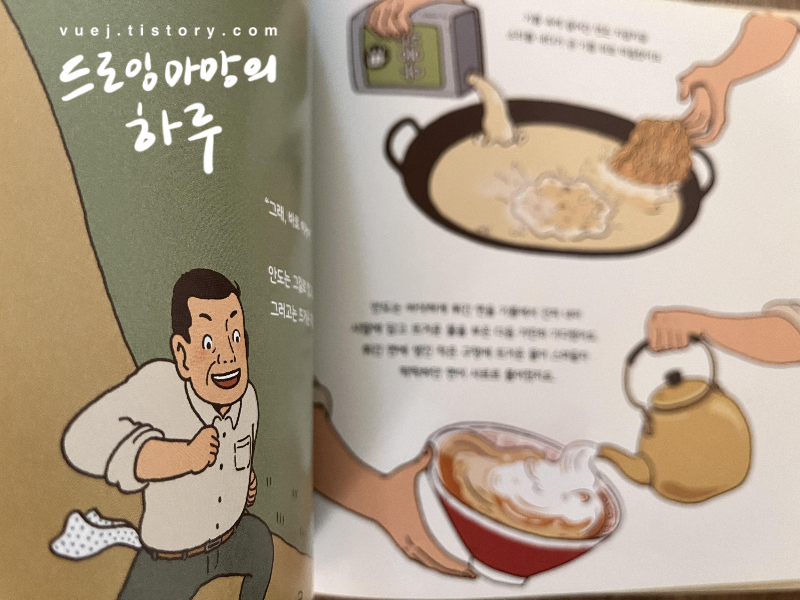 유독 라면을 좋아하는 우리 집 아이가 책을 잘 안 읽어서 고민이시라면 이 책을 추천합니다. 리얼한 그림들이 꽤나 흥미진진해서 저도 한번 봤습니다. 재밌더라고요. 특히 주인공이 라면을 만들게 된 계기, 내가 원하는 라면을 만들기 위한 노력들이 자세히 나와있어서 아이와 이야기 나누면 함께 읽어보기에도 좋은 책이라는 생각이 들더군요.